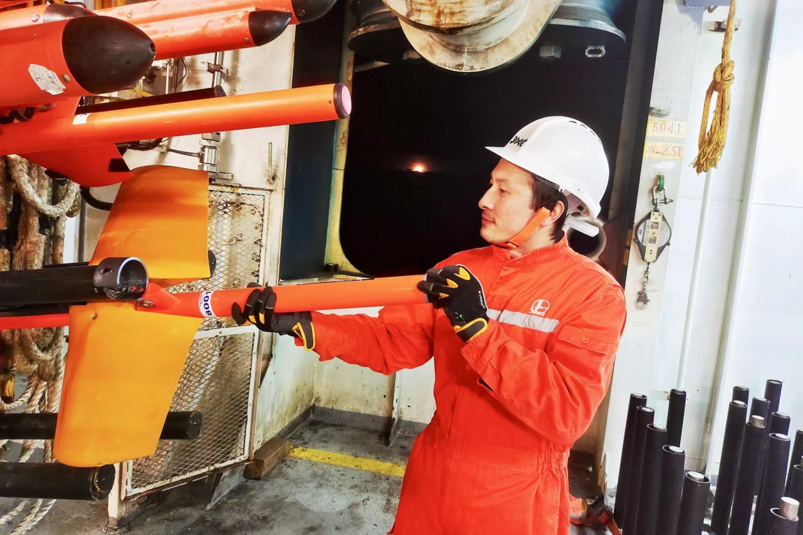 发现6号,挪威海域,导航领班赵启超正在整理地震设备。