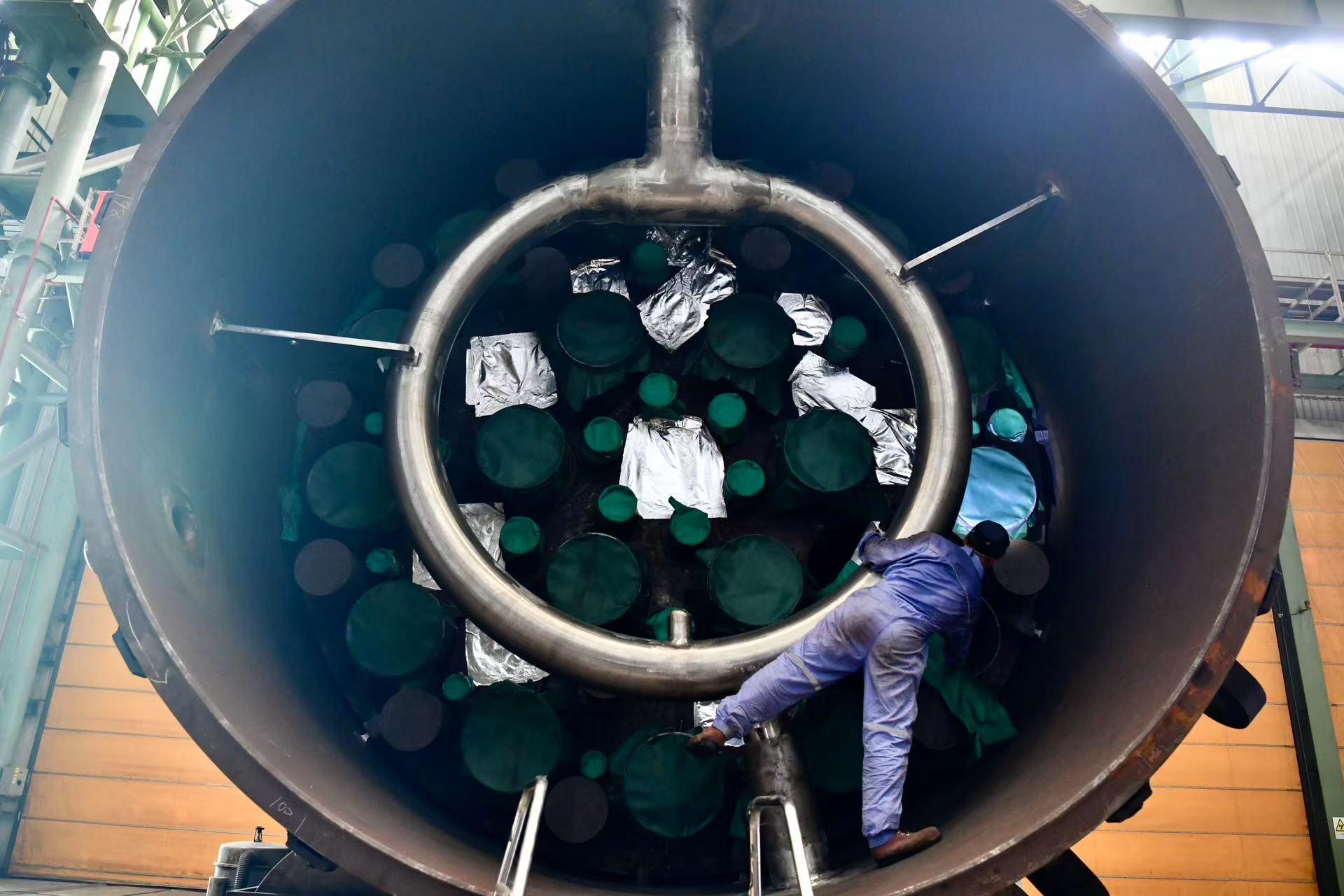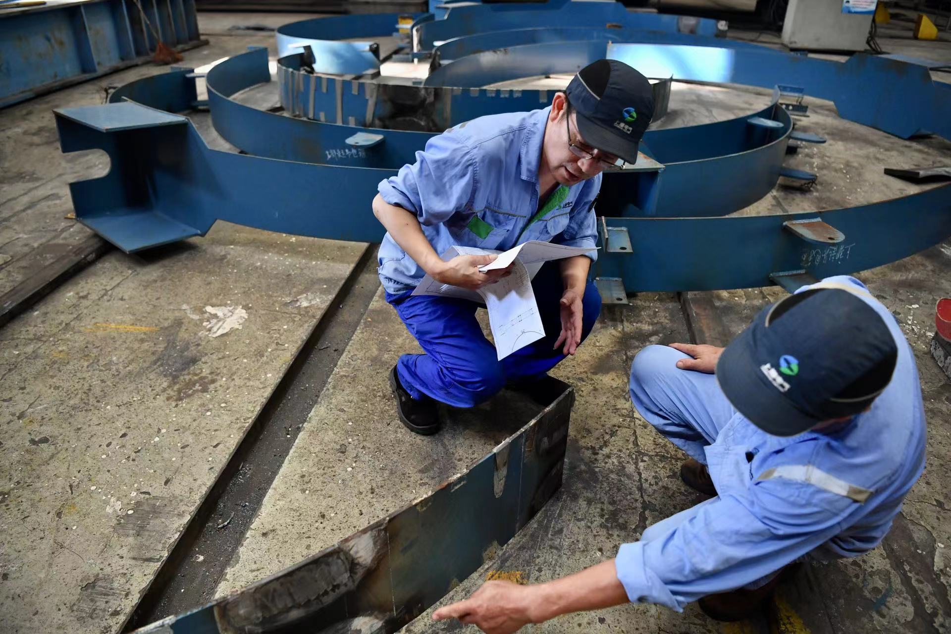 (上海电气核电设备有限公司的一线员工为“华龙一号”核电核岛主设备制造和总装加班加点。)