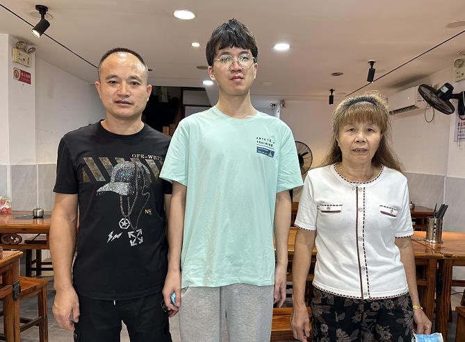 (50岁的施小康身边站着24岁的儿子(左二)与70岁的母亲(右一),身后是一家人靠着努力打拼出的小饭馆。)