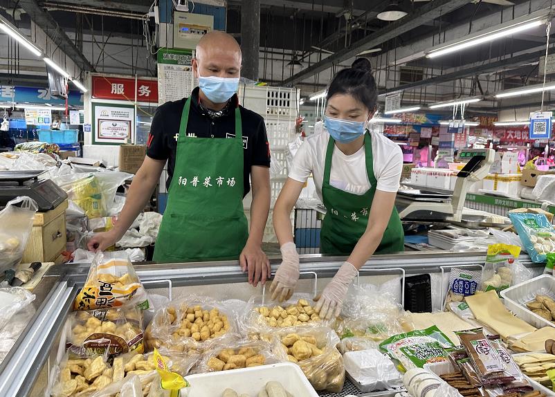 “我们一家人都在这个菜市场里。”从黄鳝摊头向北走10多米,便是施小康弟弟与弟媳的豆制品小摊,夫妻两人是菜场清美豆制品经营合作商,豆腐小摊的拐角则是施小康母亲经营的黄豆芽小摊位。