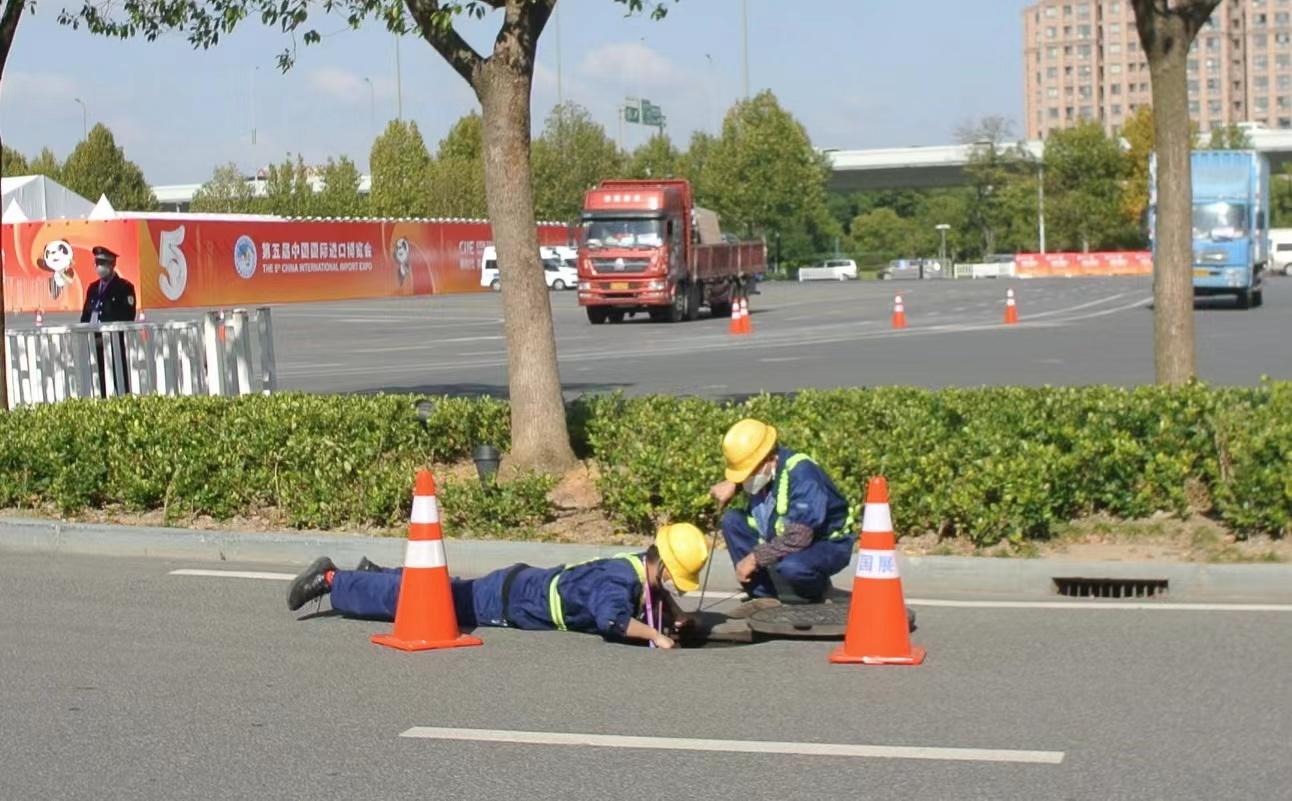 (图片说明:秦永涛和队友正在排查进博场馆雨污水井问题)