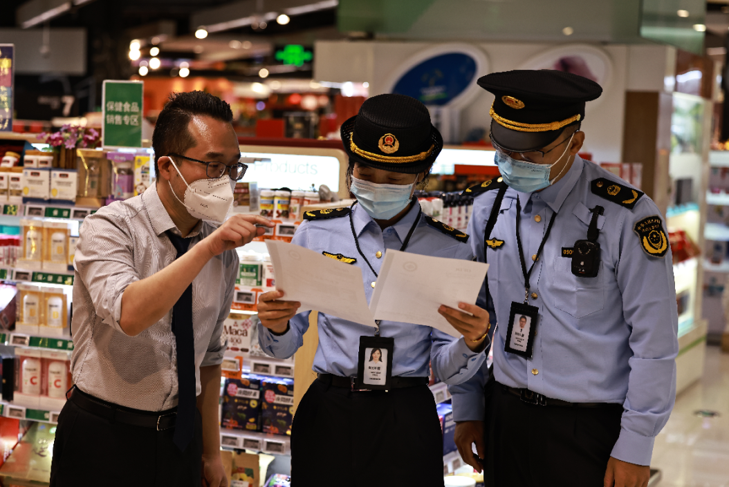 (市场监管人员检查进博会周边大型商场超市内有机食品质量及相关价格情况。图片由市场监管局提供。)