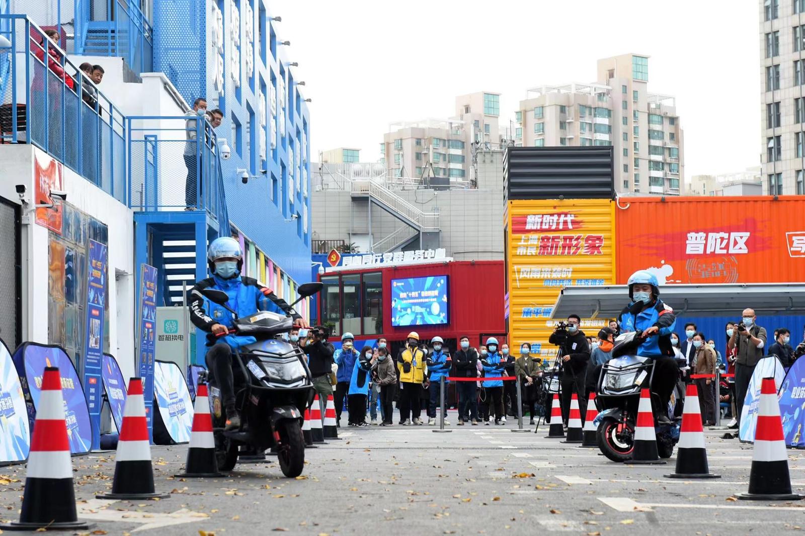 25日下午,上海市首届网约配送员职业技能大赛决赛在普陀区新业态新就业党群服务中心举行。本次决赛设置了“情景演练”“配送技能”“骑行技能”三大比拼环节,经过全市范围初赛选拔的22名“顶尖骑手”向冠军发起冲刺。上海市总工会副主席周奇,普陀区人大常委会副主任、区总工会主席姚军等现场观摩了比赛。