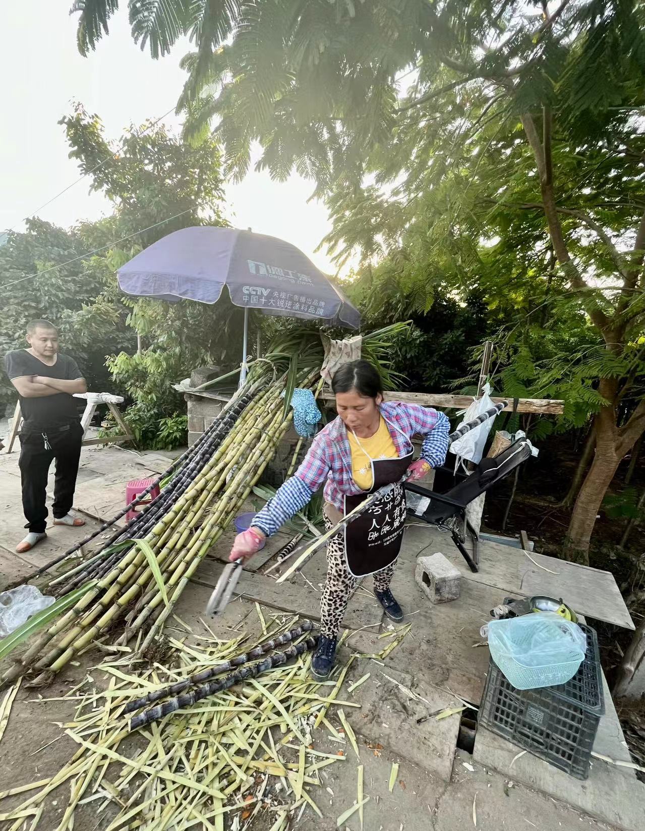 村民售卖的是他们自己种植的甘蔗,分为本地的罗汉蔗和外地的黑金刚。“两种都尝尝,口感不一样,看你喜欢哪一种。”来自附近高粱费村的李阿姨热情地招呼着记者,并麻利地拿着砍刀切了起来。