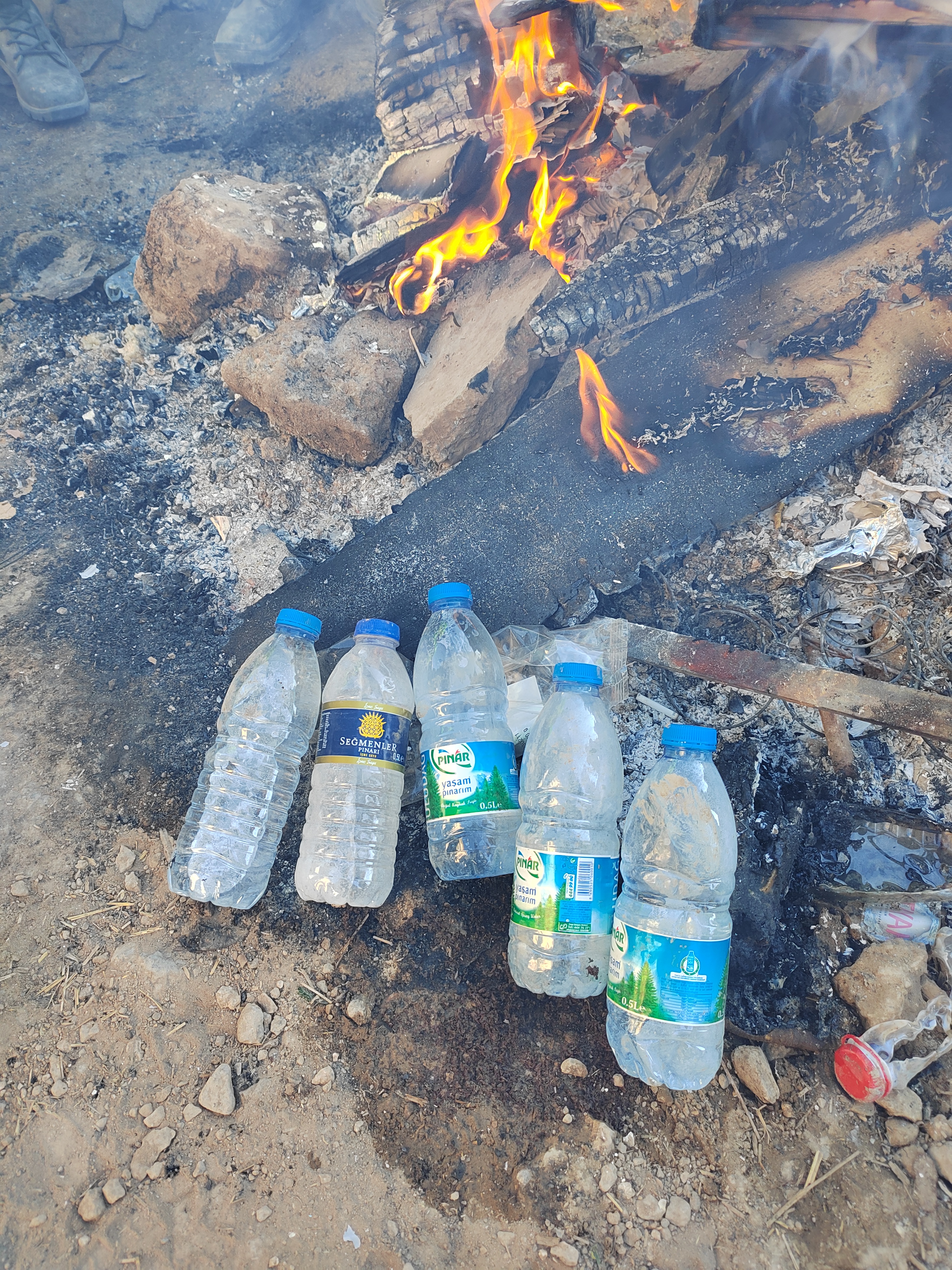 伊斯坦布尔温度极低,火堆旁的矿泉水也冻住了。受访者供图