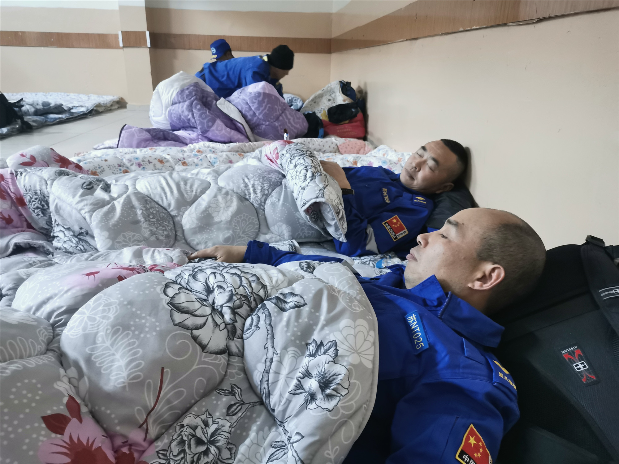 马海洋(前二)在临时休息处的地铺上休息。受访者供图