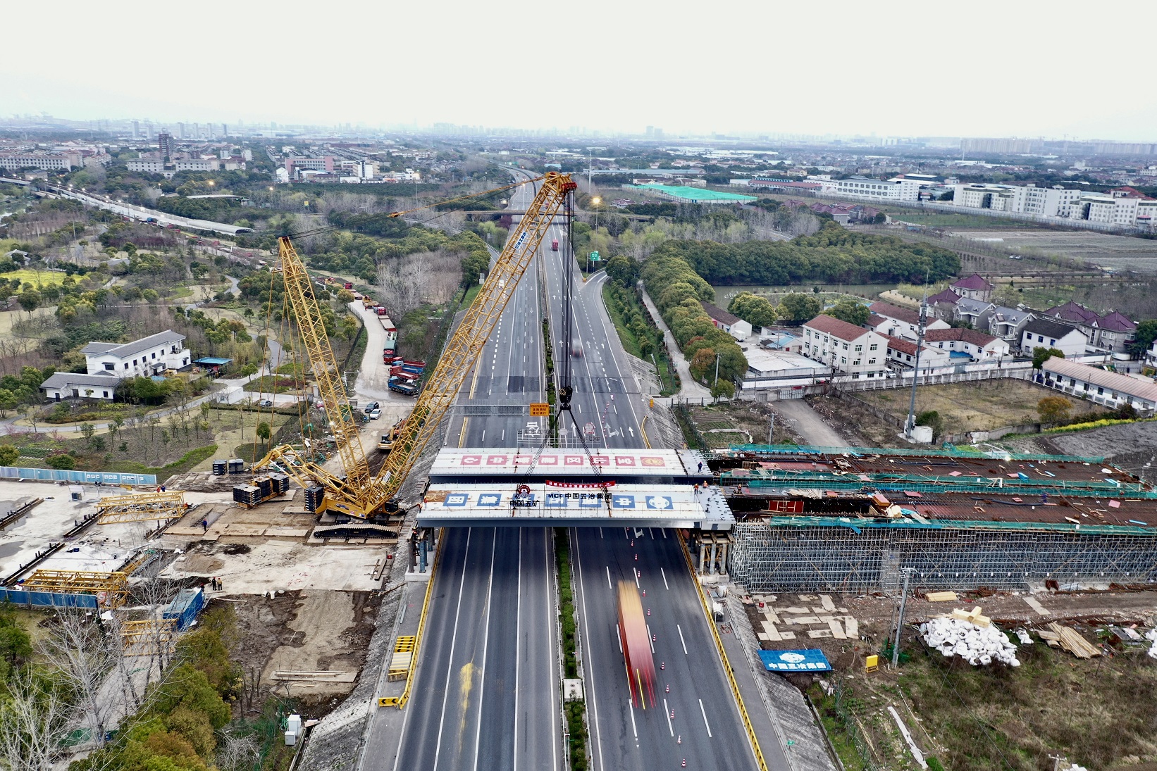 记者了解到,该工程是上海市重大工程——大型居住社区(顾村大居、罗店大居)外围市政配套道路项目,宝山区“八纵十三横”中网络骨干路网的组成部分。项目南起鄱阳湖路,北至杨南路,工程沿线共跨越5条现状及规划河道,下穿沪通铁路、上跨G1503高速,全线共设置6座桥梁,项目总长约2.45公里。本次G1503高速跨线桥主梁采用钢混组合体系,总长56米,总宽24米,其中G1503高速正上方的跨中节段长37.5米,单幅重达246吨,采用800吨履带吊一次吊装到位,其余节段采用分段拼装。