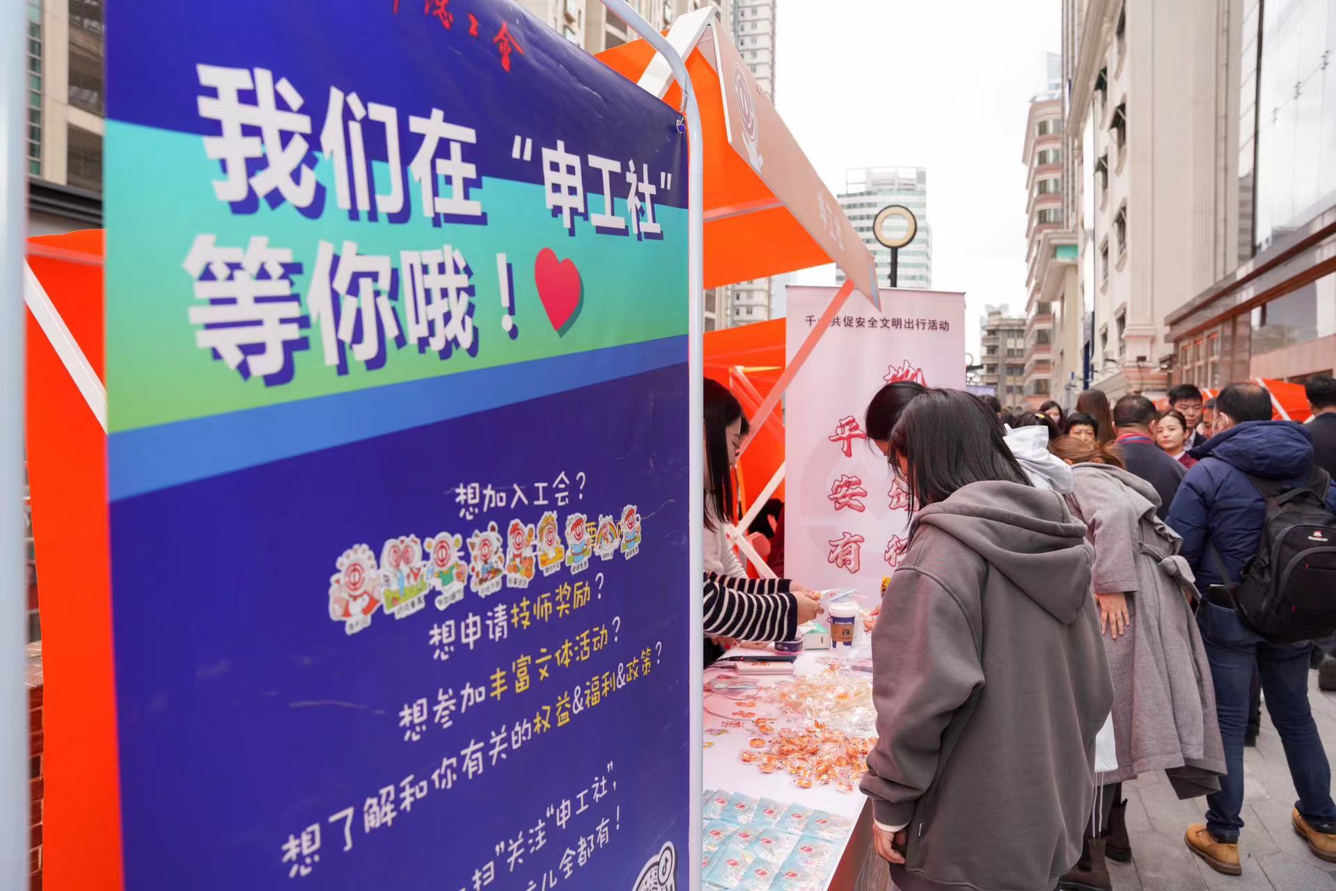记者在现场看到,当天活动设置了“幸福直通车”的“起始站”“幸福静彩站”“活力焕新站”“公益加油站”“品质生活站”五大展区。在“起始站”,“申工社”宣传区、地铁安全出行区、上海农商银行会员服务区等为职工介绍相关知识、服务,推介各类工会福利活动。