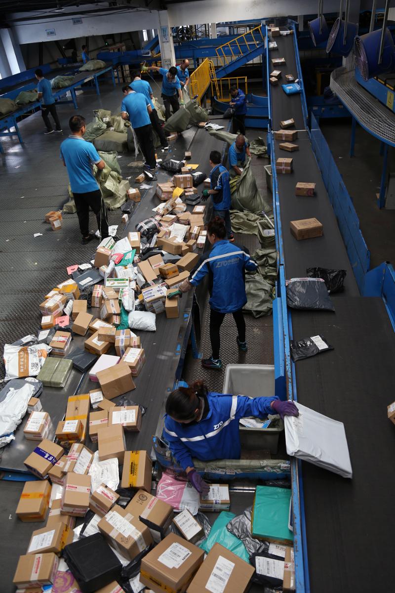 在中通集团青浦分公司内,发往全市的中小件快递货物在这里按区域分配