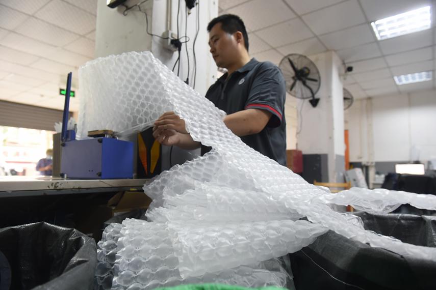 快递小哥正在站点抽取大量包装纸,为前往商家取货打包做足准备