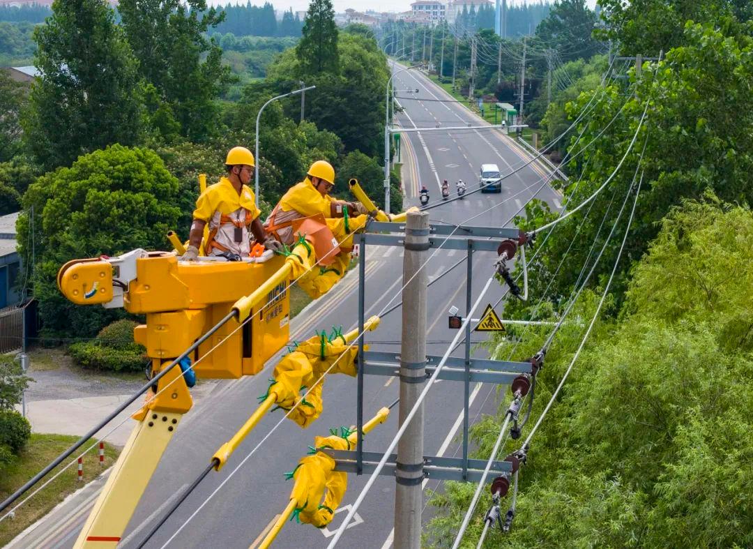↑7月6日,带电作业人员全副武装在江苏省泰州市海陵区对10千伏采陵线耐张线夹温度异常进行抢修作业。工人日报通讯员 汤德宏 摄