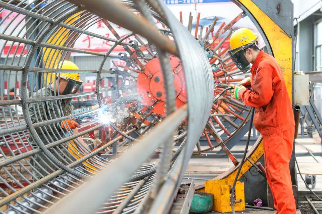 ↑7月5日,江西省赣州市创业大桥项目施工地,工人冒着高温在焊装钢结构拱梁。工人日报通讯员 朱海鹏 摄