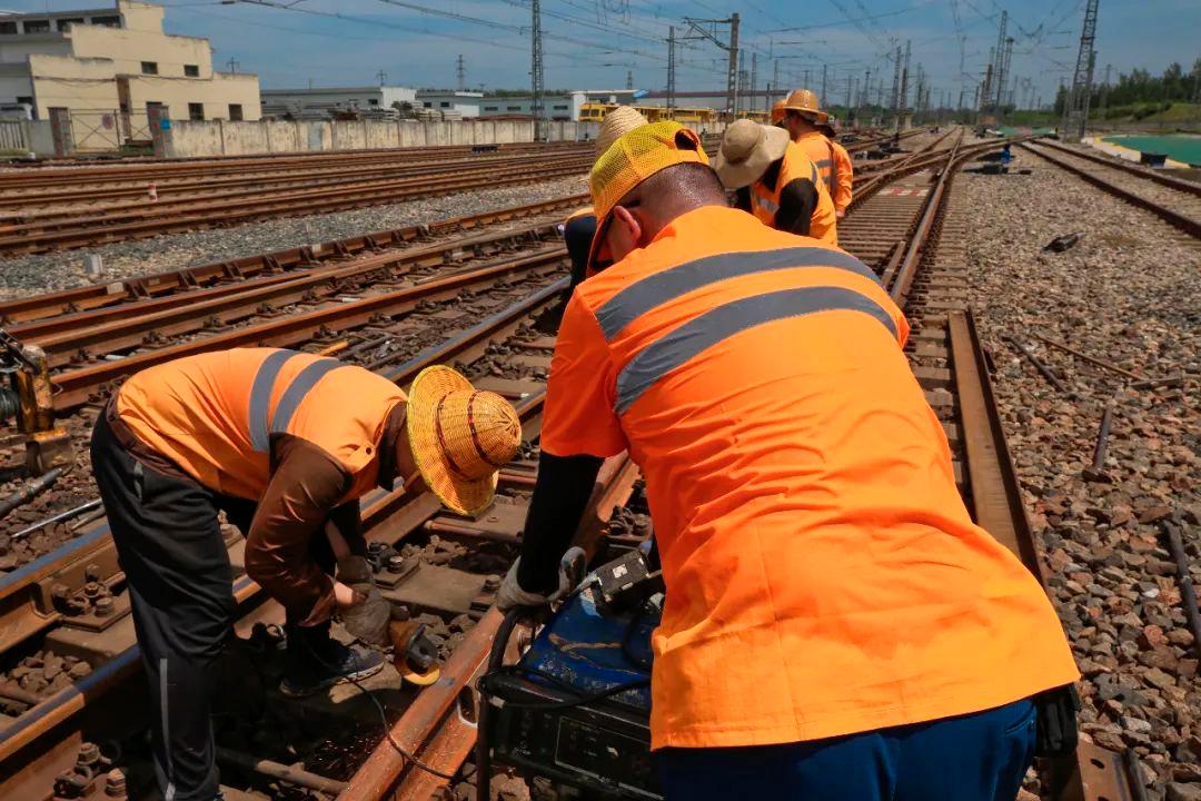 ↑7月6日,河南省南阳市工务段维修人员在线路上对更新的钢轨进行更换整治安装到位。工人日报通讯员 张中海 摄