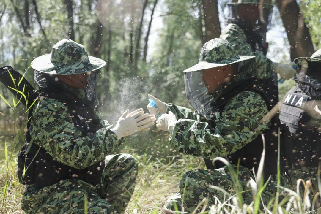 ↑7月2日,在新疆阿勒泰边境管理支队科克托海中心边境警务站,民警在巡逻时互喷防蚊药。盛夏时节,这里的蚊虫种类多、毒性大,每次巡逻前,他们都要“全副武装”做好防护。工人日报通讯员 王友波 摄