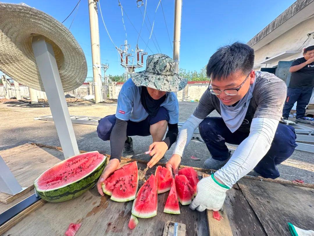 ↑7月5日,中铁电气化局运管公司上海维管处合肥维管段,在工作间隙,给接触网线路进行冷滑实验的员工分发西瓜防暑降温。工人日报通讯员 柳百发 摄