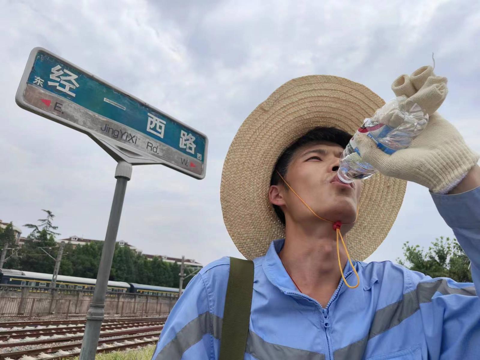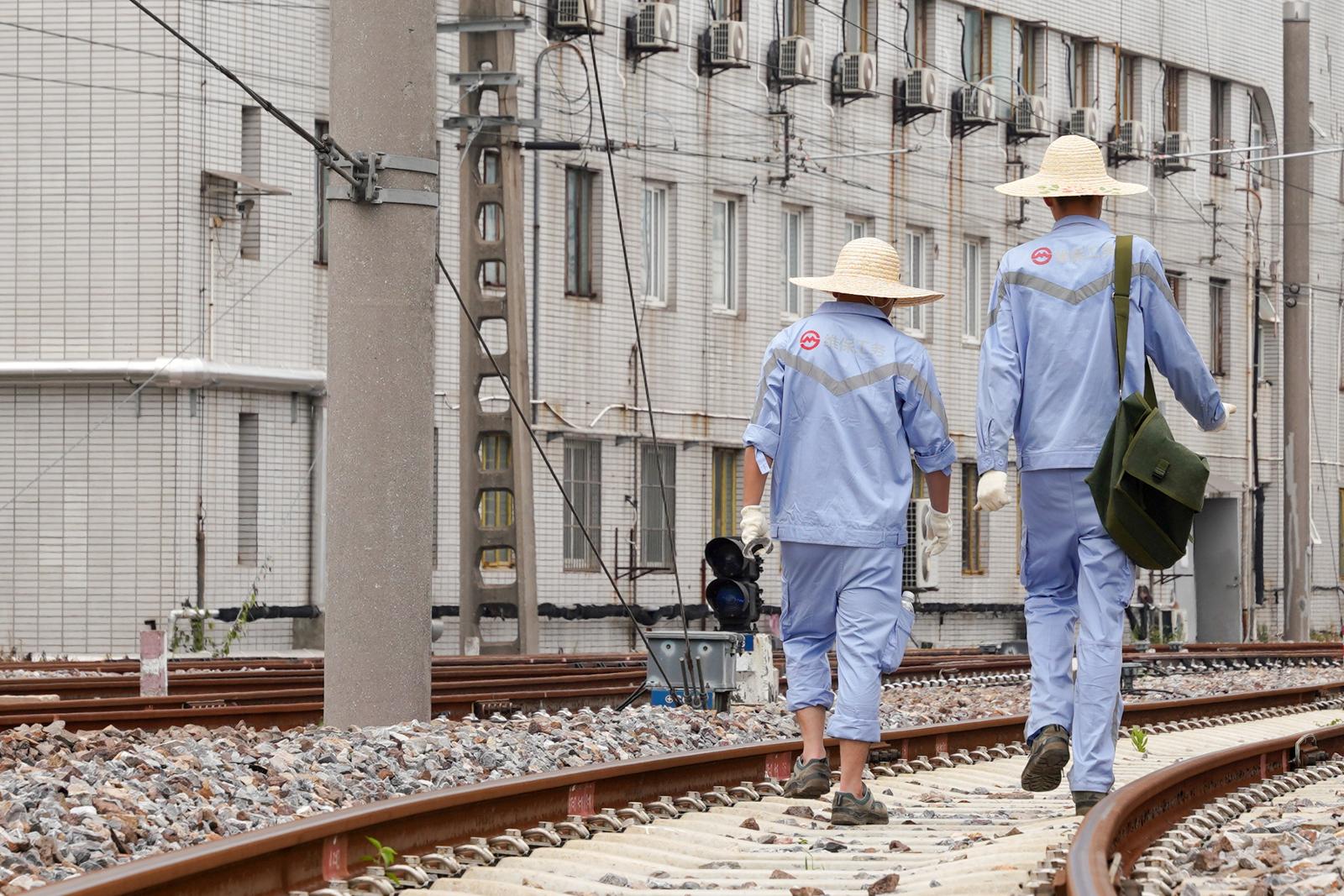 中午时分,户外气温接近36℃,钢轨温度超过50℃。郑建国和杜辰杰两人手拿检查锤和长扳手,背上巡道包,开始了高温巡查作业。郑杜两人巡道已有10多年,是班组里的老资历。上道前,他们会先喝上一瓶藿香正气水。“防中暑还得靠它,比什么冰马甲都有效。”