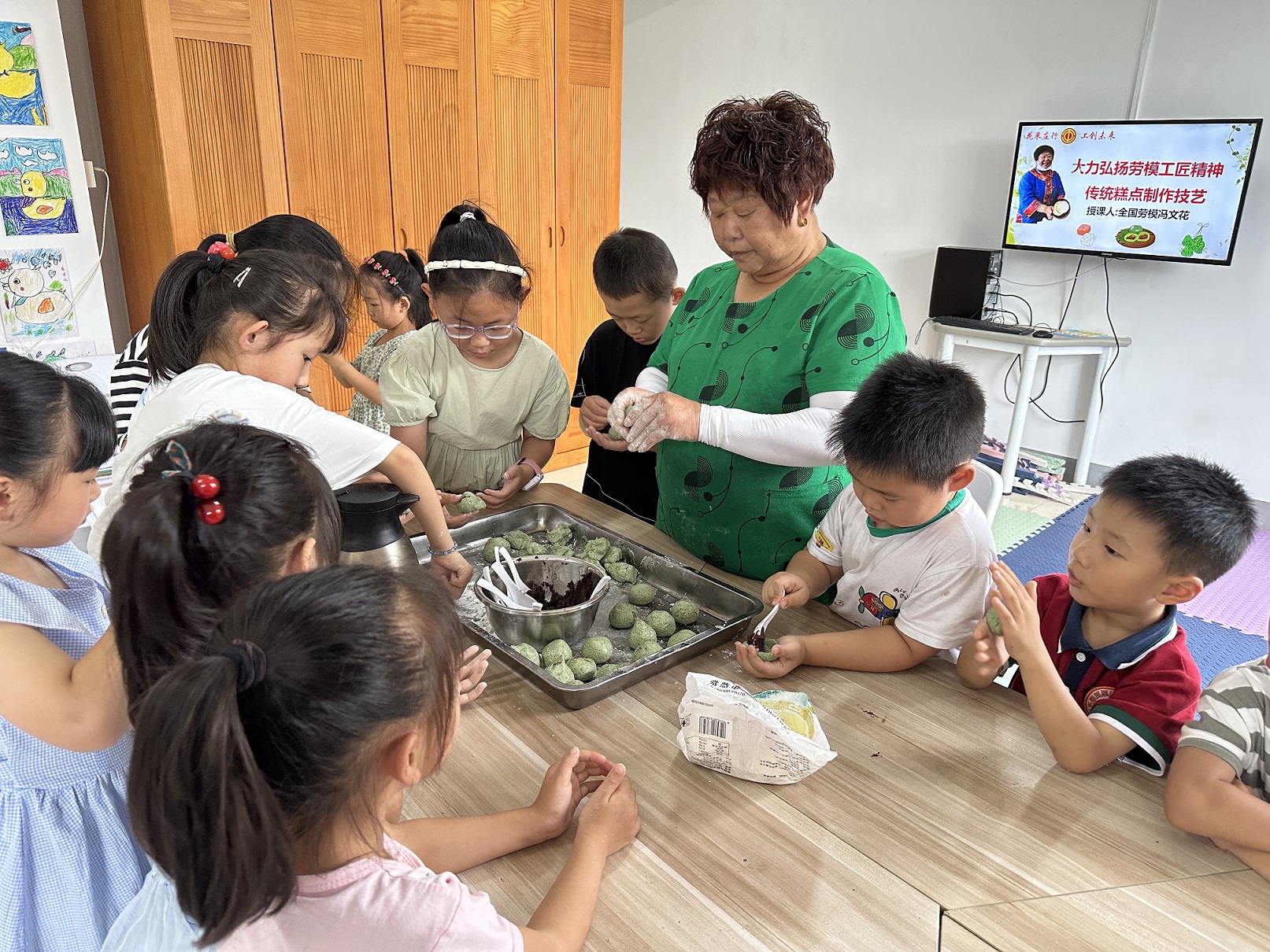 全国劳模冯文花在庄行镇公司职工暑托班教授青团、烧饼等传统上海糕点制作。