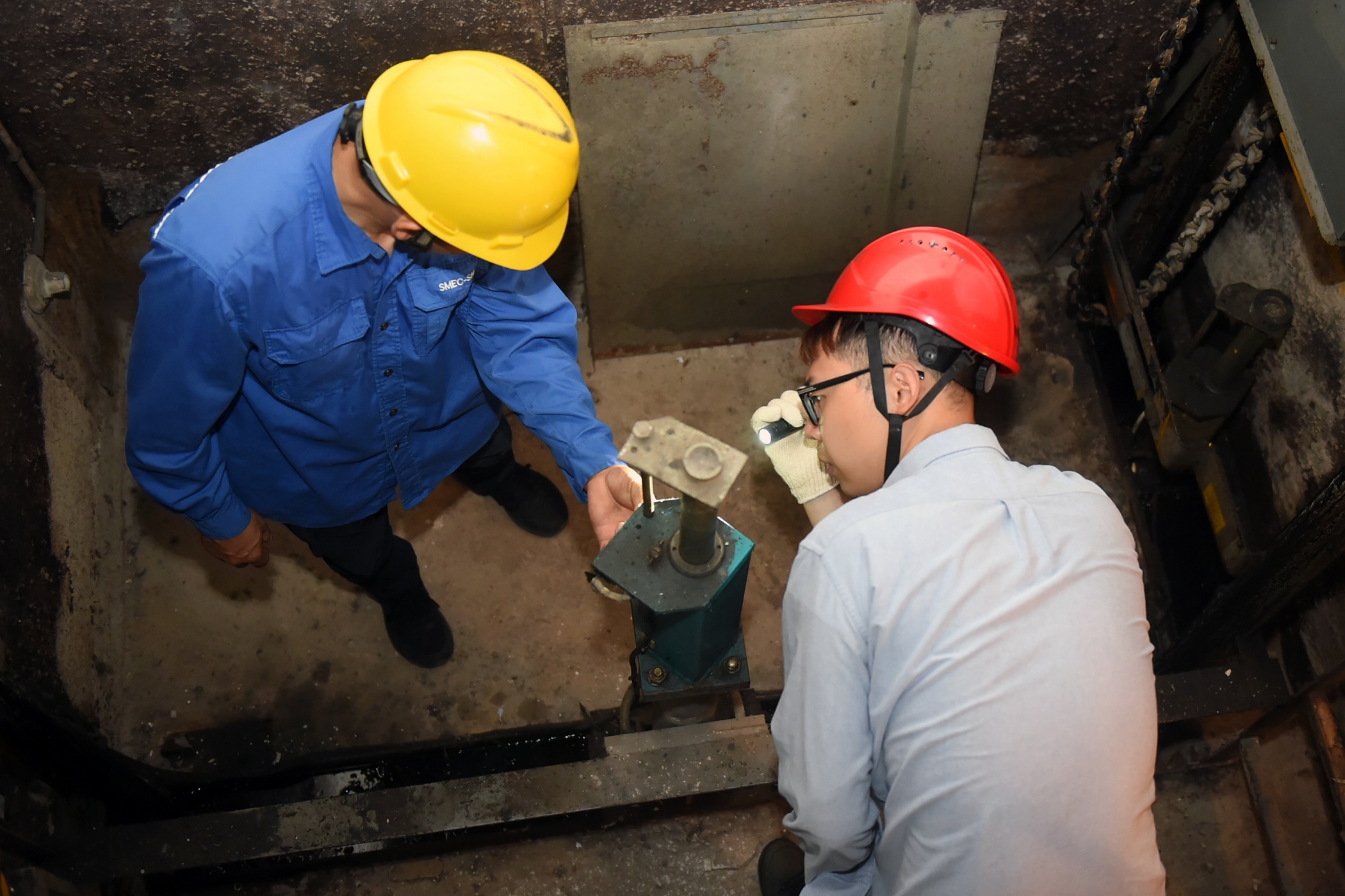 工作人员检验电梯缓冲器。