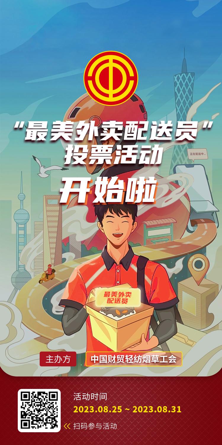 为深入学习贯彻党的二十大精神,贯彻落实习近平总书记关于做好关心关爱新就业形态劳动者群体工作的重要指示精神,展现外卖配送员风采,提升外卖配送员的职业归属感和荣誉感,营造关心关爱外卖配送员的良好社会氛围,中国财贸轻纺烟草工会开展“最美外卖配送员”推荐宣传活动。