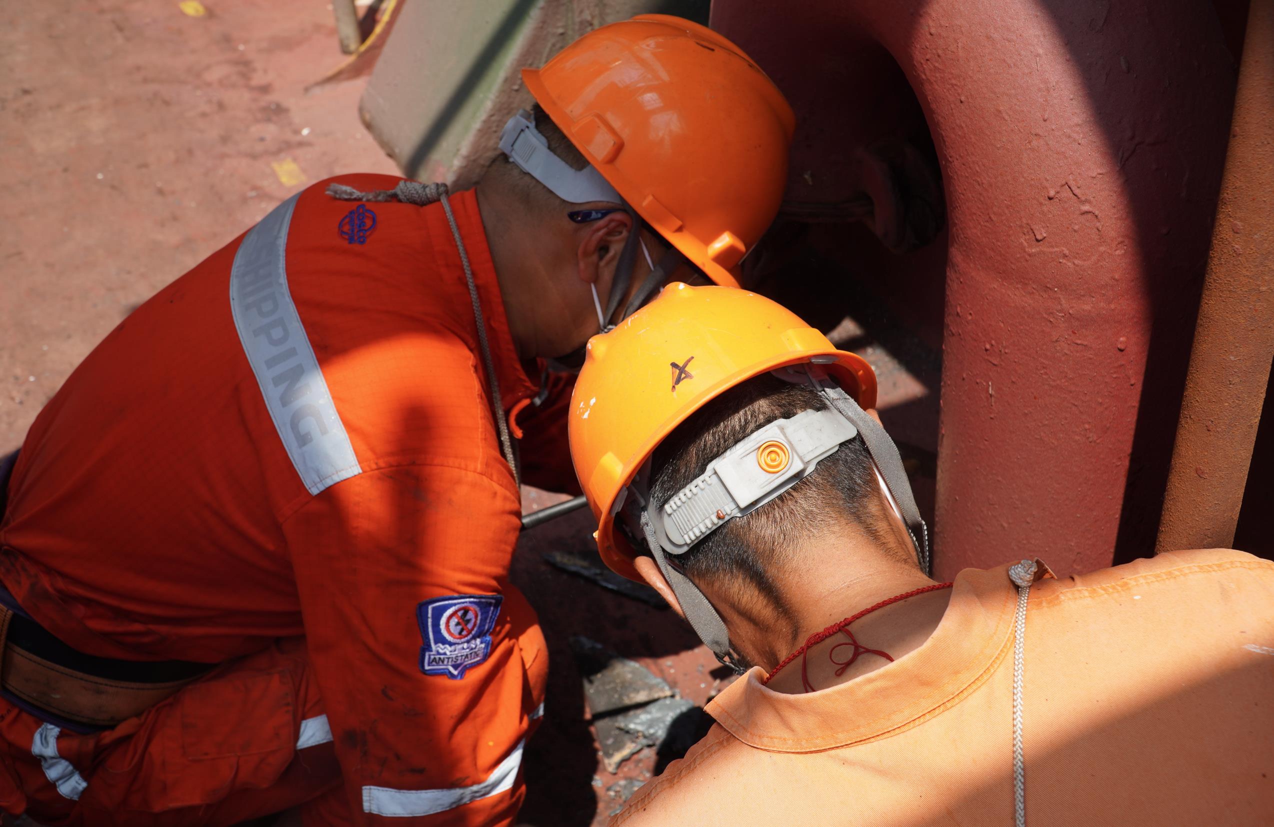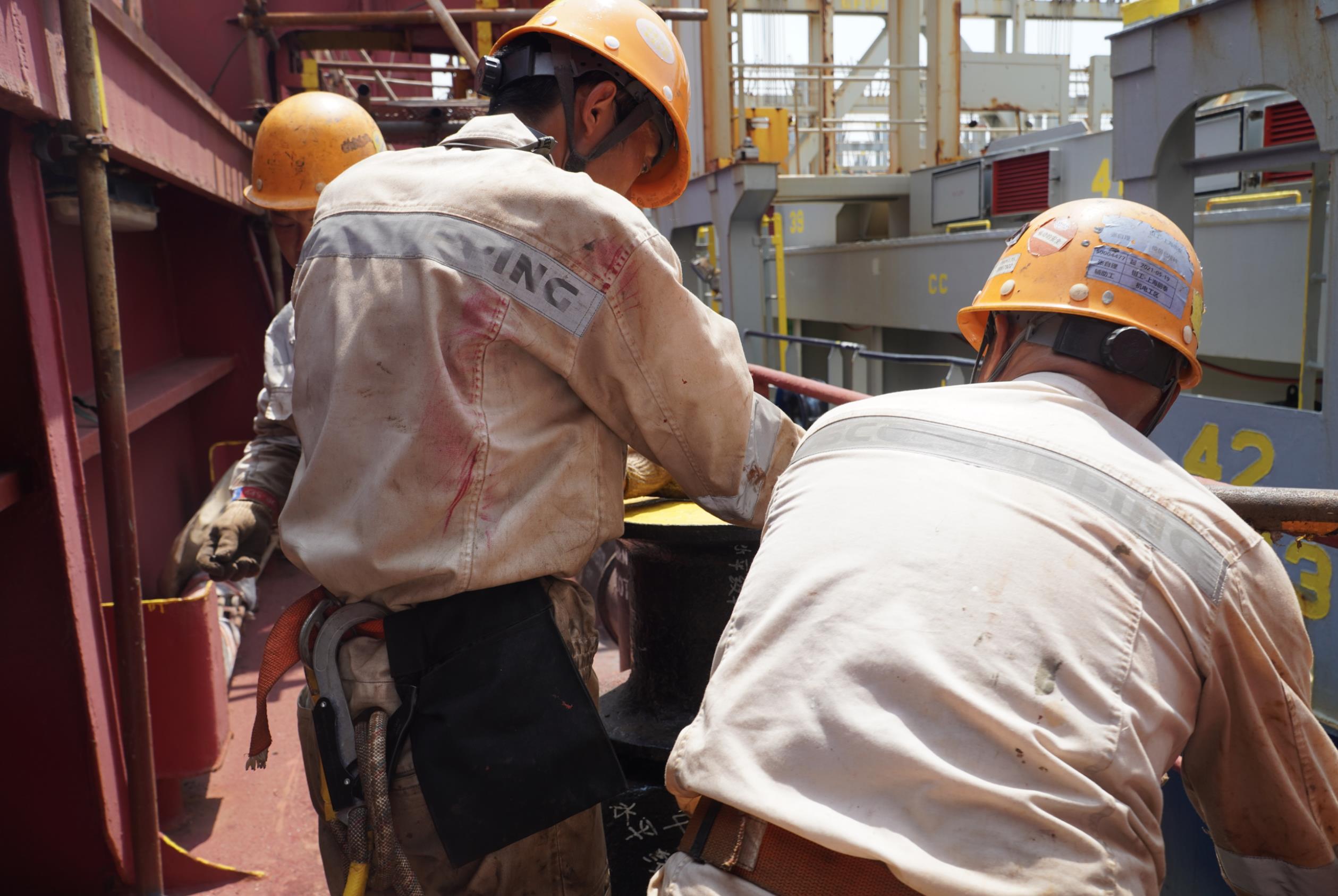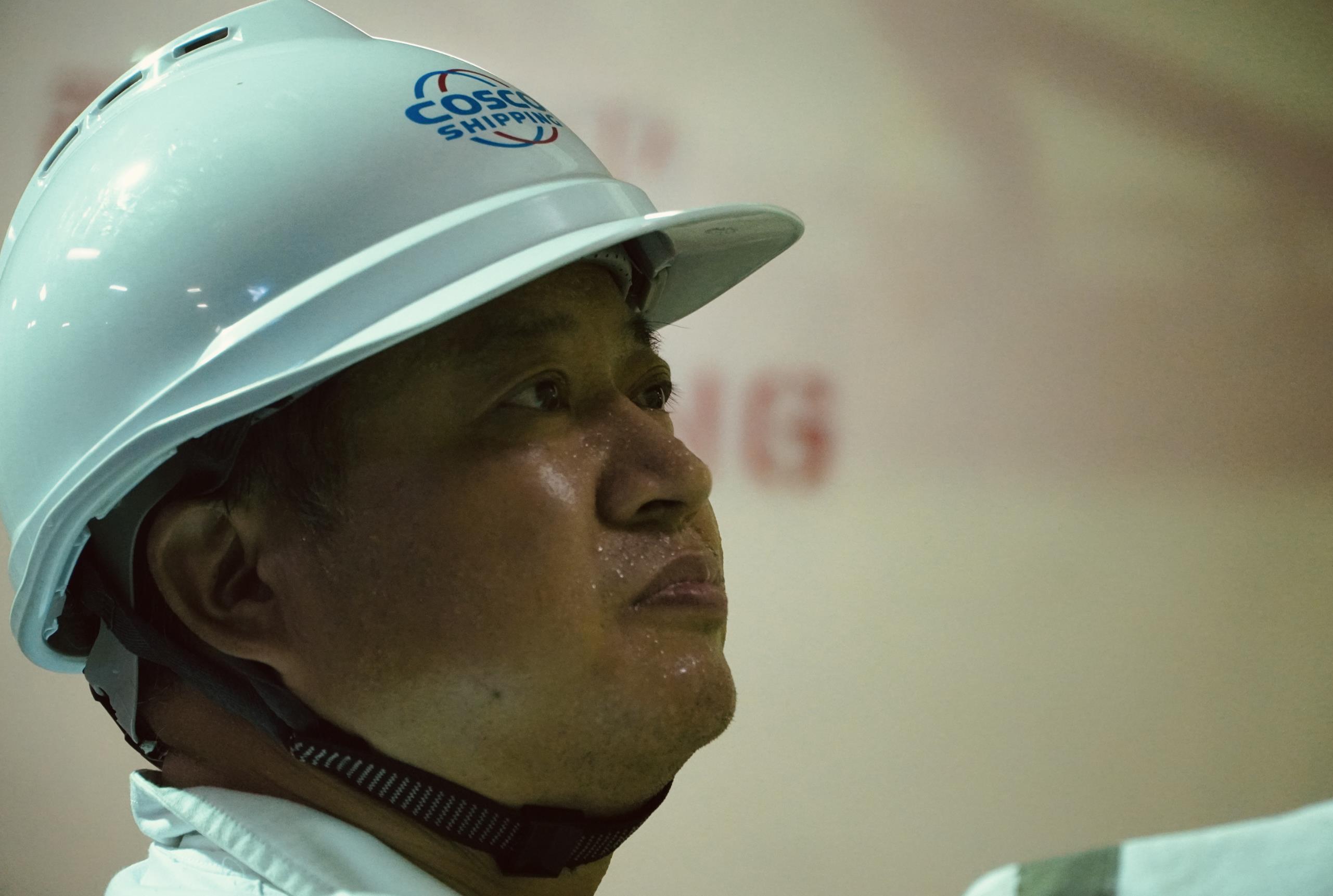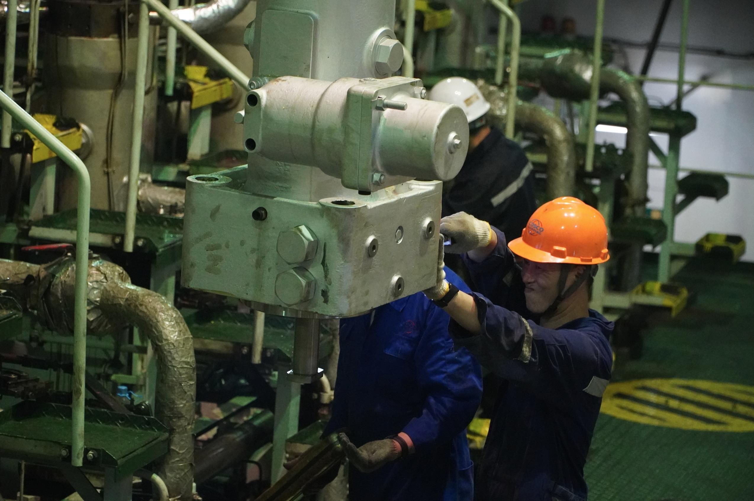 机舱内,发动机的轰鸣声未见消退,与各处修理加工发出的声音交织在一起。在船上,管理级别的船员工作服通常为白色,轮机长杨庆荣的制服颜色最为特别,“白里透着黑”,本就要与各类机械打交道,加上修船工作,不过开工短短两个小时,他的制服上已经染满油污。由于内部空间封闭,机舱内的温度高达四五十摄氏度,在机舱里工作,汗从来不是“滴”下来的,一滴滴汗水汇聚,一个劲儿往下“流”。