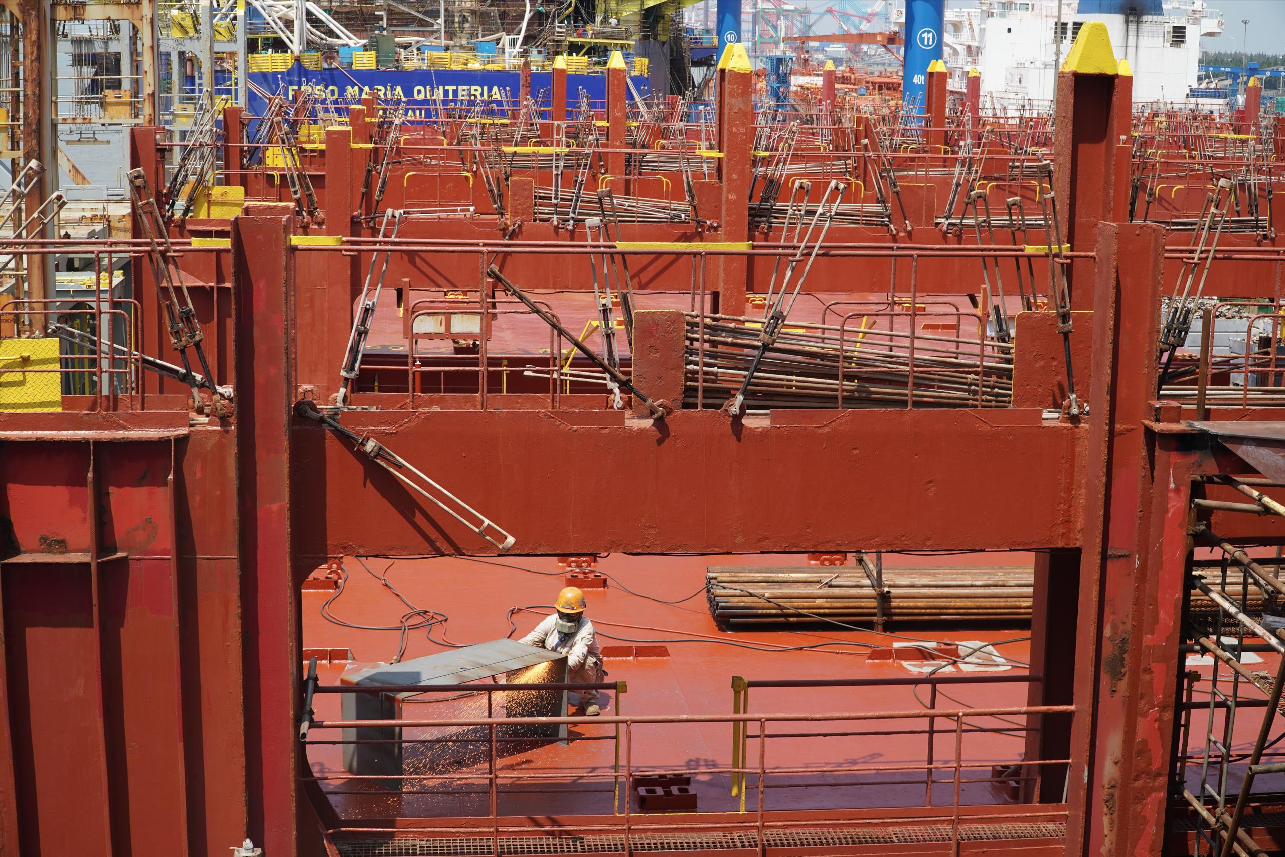甲板上,烈日当头,狭窄的过道里水手忙着加工修理。放置集装箱的甲板上,工人手持焊枪加工铁板,焊花四射。在一条走道里,记者偶遇了匆匆忙忙的大副陈锋,他手里拿着一沓表格四处确认,算得上修船期间最忙的人。陈锋告诉记者,甲板上所有跟修理相关的事情他都要关心。陈锋的家也在相隔不远的崇明岛上,修船开始,他一次也没下过船,理由无他,“忙,实在是太忙了。”