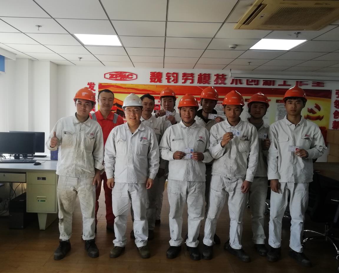 魏钧(前排左二)与工作室导师带教的新员工,在取得焊工证后拍摄合影。