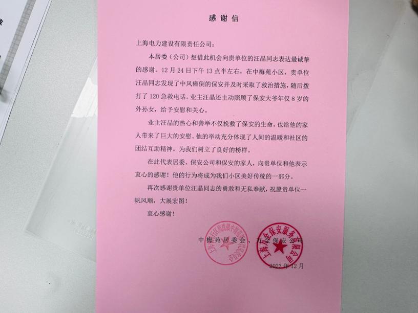 近日,上海电力建设有限责任公司收到了一封来自闵行区中梅苑居委会和保安公司的联名感谢信,而市场部主管汪晶在小区内出手相救保安的温暖事迹得以在上海电建内传开。