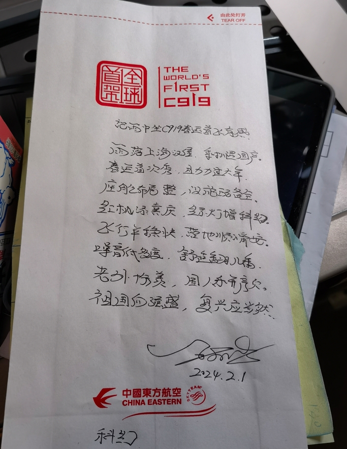 当天17:26,航班抵达北京大兴机场后,一位乘客为国产大飞机赋诗一首