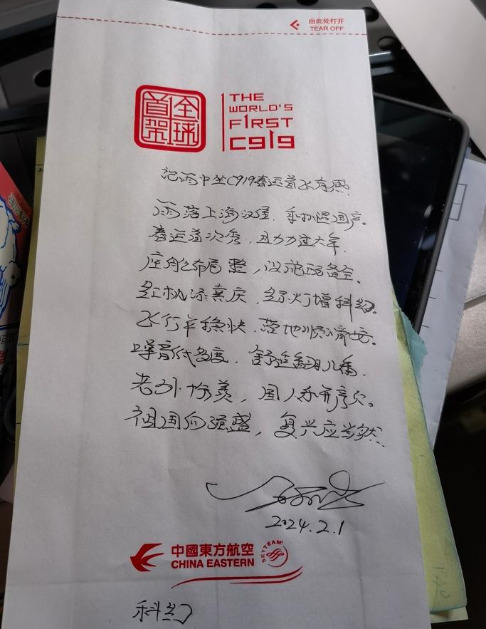 15时许,旅客陆续开始登机。“今年是国产大飞机C919首度服务春运,我们乘坐C919从上海飞往北京,共同开启一段从黄河路到南锣鼓巷,石库门弄堂到老北京胡同的新春旅程……”全部旅客坐定后,方璇拿起话筒,面带微笑开始向大家致这份特别的欢迎词。她向记者透露,航班上,乘客们除了能听到这段他们精心设计的欢迎词,吃到一份具有海派特色的冷餐,喝上一盒大白兔牛奶,还有机会获得一份印有C919机型的专属心意卡,“我们特别希望旅客们能在国产大飞机上度过一个温馨难忘的归家旅途。”