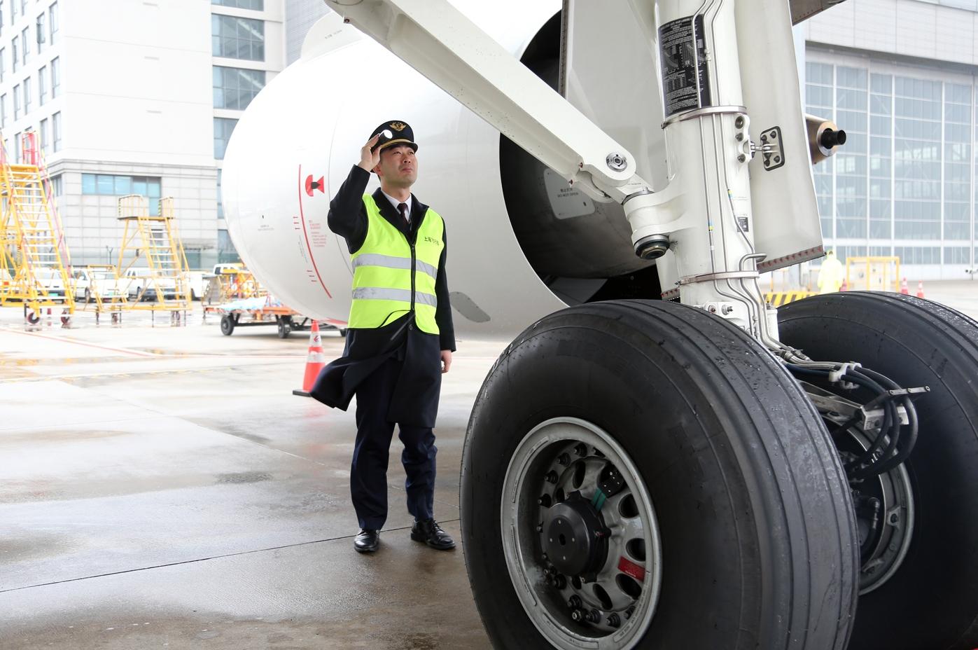 机长李晓亮在绕机检查