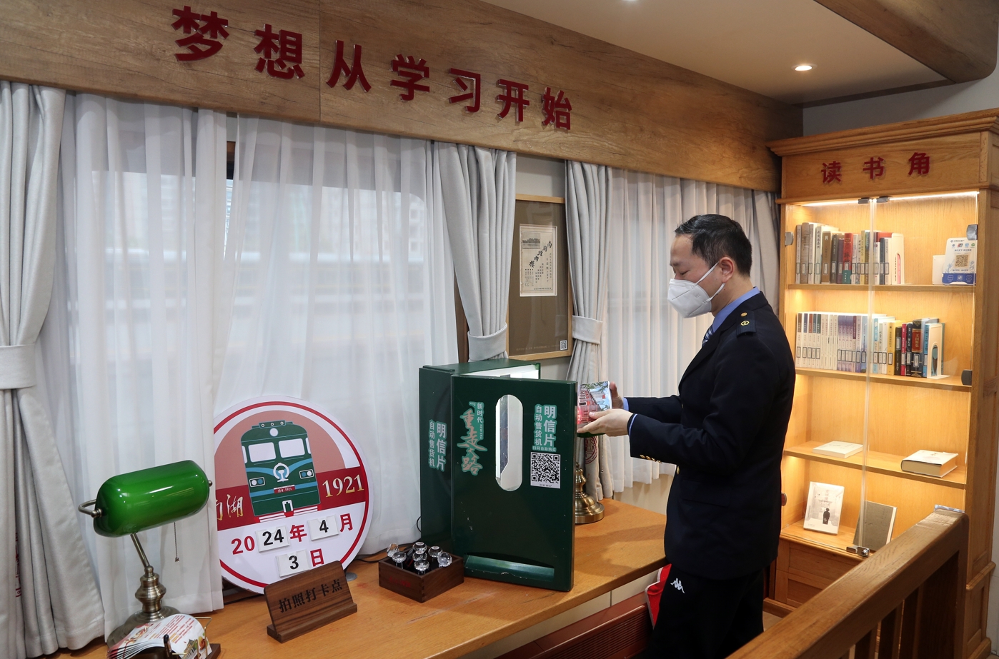 列车将两节车厢改造成红色主题功能车厢,设有“火车邮局”“党史学习角”等功能区域,列车员在为”火车邮局“增补明信片,供旅客集章、邮寄。