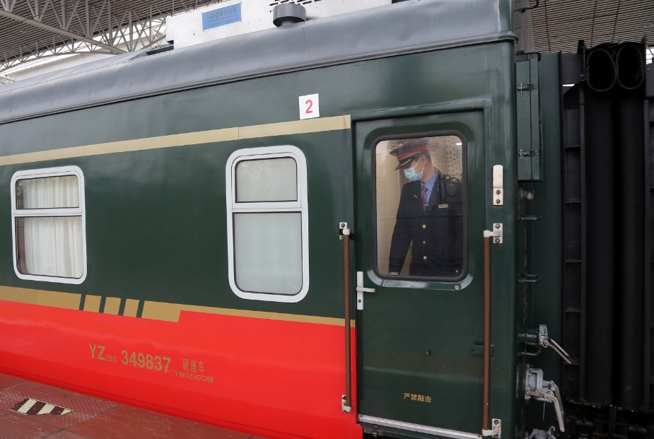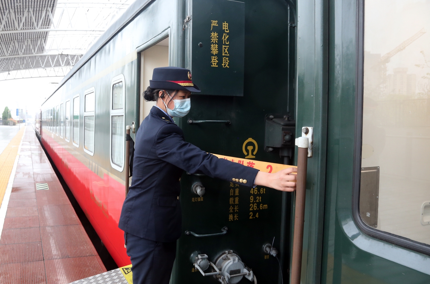 列车员关门前在车门处瞭望。