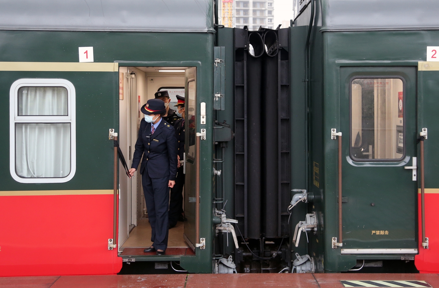 列车员在车厢连接处拉上警示带。