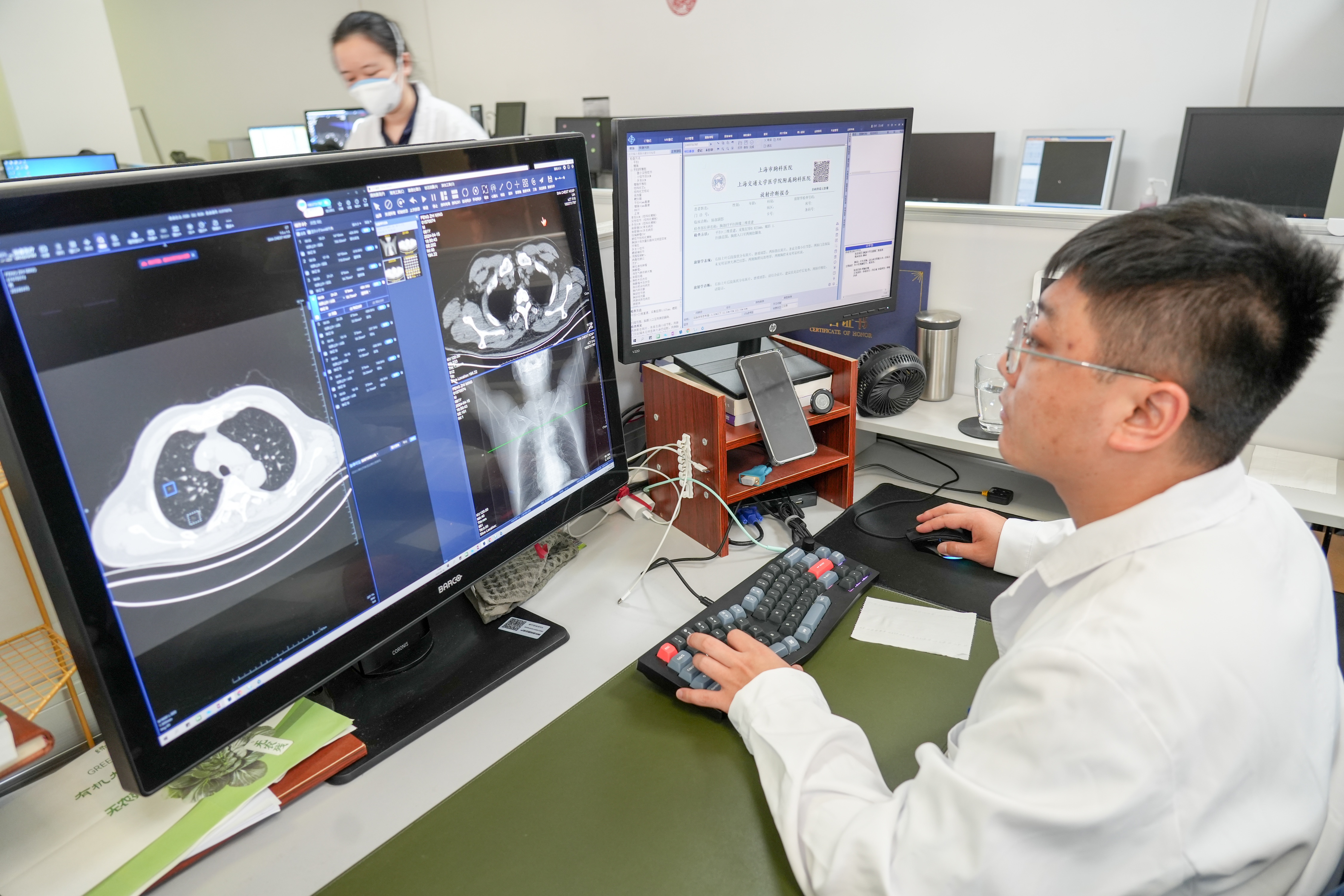 在放射科采访时,胸科医院放射科副主任医师江一峰对记者表示,在有了AI辅助后,他们每天能完成的阅片量明显增加,工作效率大大提高。很多年前,那时的CT检查往往都是厚层扫描,医生诊断一位病人的胸部CT影像每次需要看约总共100-120张断层图像,完成一个病人的诊断至少约10分钟左右。随着影像技术的发展,胸科医院的胸部CT检查早在近二十年前就采用了薄层扫描,每层CT图像的厚度约1毫米,放射科医生在进行诊断时一般还要再查看纵隔窗和骨窗图像,因此放射科医生诊断一个病人时需要审阅的图片数量高达600-700张,医生的工作量大幅提高。有了AI系统辅助后,它能提前准确的圈出了可疑的结节的位置,医生的阅片效率大大提高,这也让医生们可以每天为更多的病人服务。