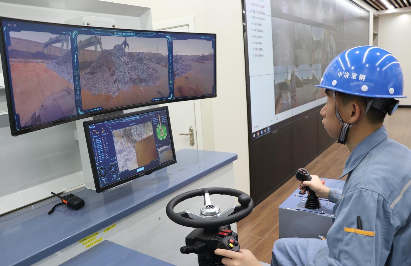 中冶宝钢技术服务有限公司湛江钢铁废钢集控中心内,王宁正像一名白领一样,聚精会神地端坐在一比一还原的虚拟驾驶台旁,双手紧握操纵杆,对着大屏幕远程操纵着抓斗抓取废钢。在此之前,他需要在炎热、嘈杂,且充满危险的露天环境中工作。“转岗前我是废钢转驳运输车和抓钢车司机,需要手动操作,将废钢运输至配料间进行其他冶炼工序。随着AI技术的运用,我们原先的岗位被无人运输车替代了。因此,我们便从传统手握方向盘的驾驶员转岗为操纵虚拟驾驶台的技术员。”