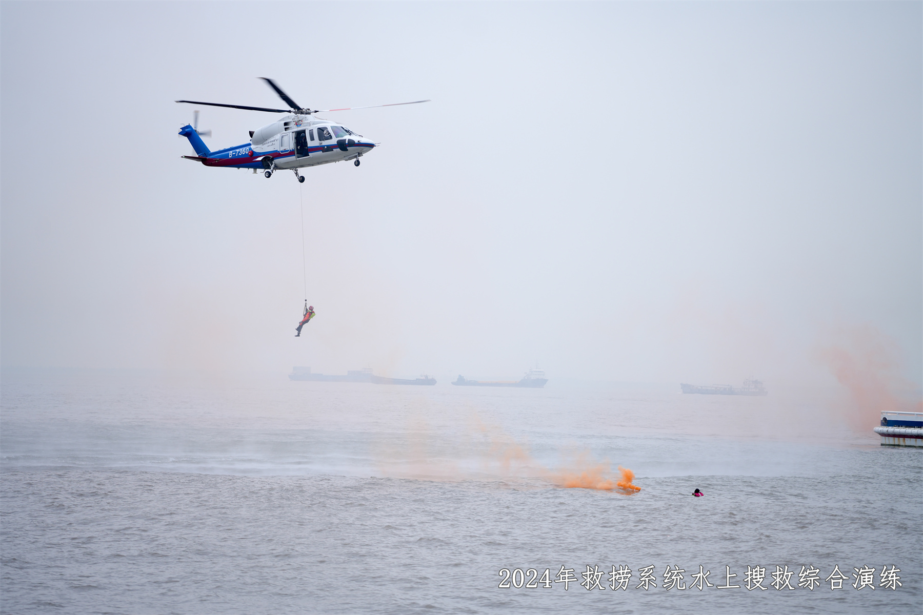演练中,救助直升机搜索发现落水人员,并开展悬停吊救