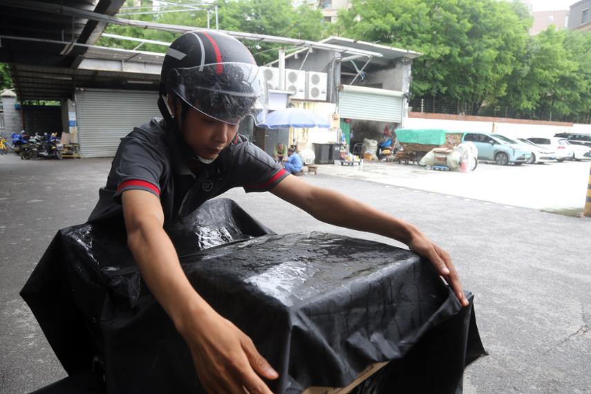 采访时正值中午,小哥们有的在清点、装配货物,准备下午的配送,记者看到,他们都会在后车兜蒙上厚厚的一层遮雨布,然后用粗绳在两端裹紧。小杜说,这块遮雨布质量很好,再大的雨,也滴不进去。“我们送的货物基本都保证不被浸湿,但我们人每天都是湿透的,雨披只能遮个大概。每天回家第一件事就是洗衣服,然后等烘干。有几次晾着晒的衣服,好几天都是潮湿的。”