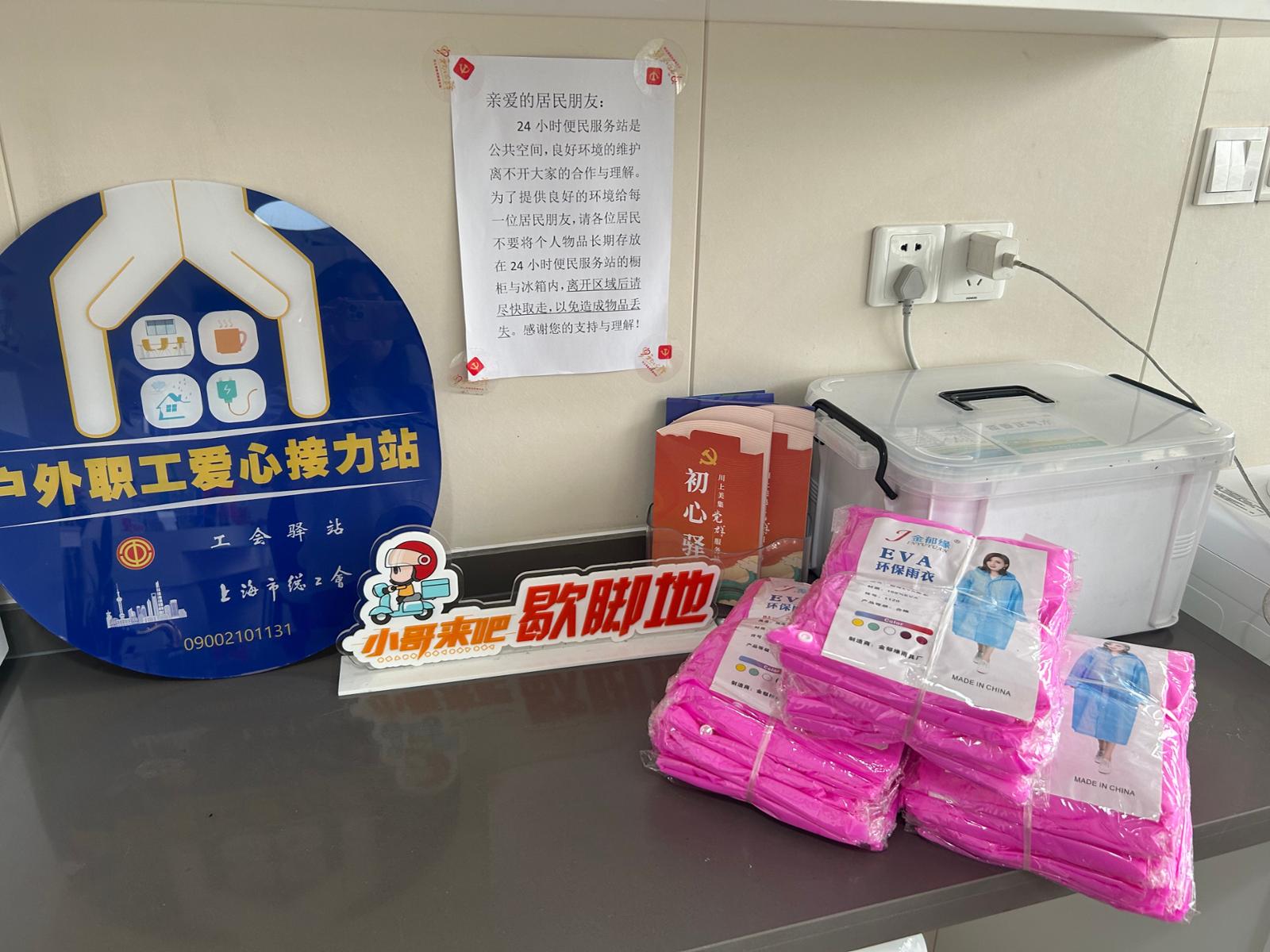 6月19日,上海“官宣”入梅,第二天上午一早,江川路街道总工会副主席金露上班的第一件事,就是和街道工会工作者们把辖区里的8个户外职工爱心接力站跑了一圈——在每个站点,他们为站点补充配备了20余件雨披。“接力站使用较多的户外职工基本以快递、外卖、网格巡查员为主,最近降雨频繁,我们补充一些防雨物资,方便户外职工们遭遇临时降雨时随时取用。”金露告诉记者。