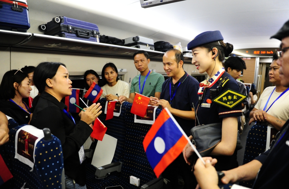 9月17日,由上海应用技术大学组织的寻访中老铁路研学实践活动在G1376次列车上进行。列车长方婷在飞驰的列车上,绘声绘色地同参加“一带一路”中老铁路互联互通人才培训项目的老挝籍学员和中老青年学生讲解中国高铁的知识,耐心解答老挝籍学员和留学生们提出的问题。