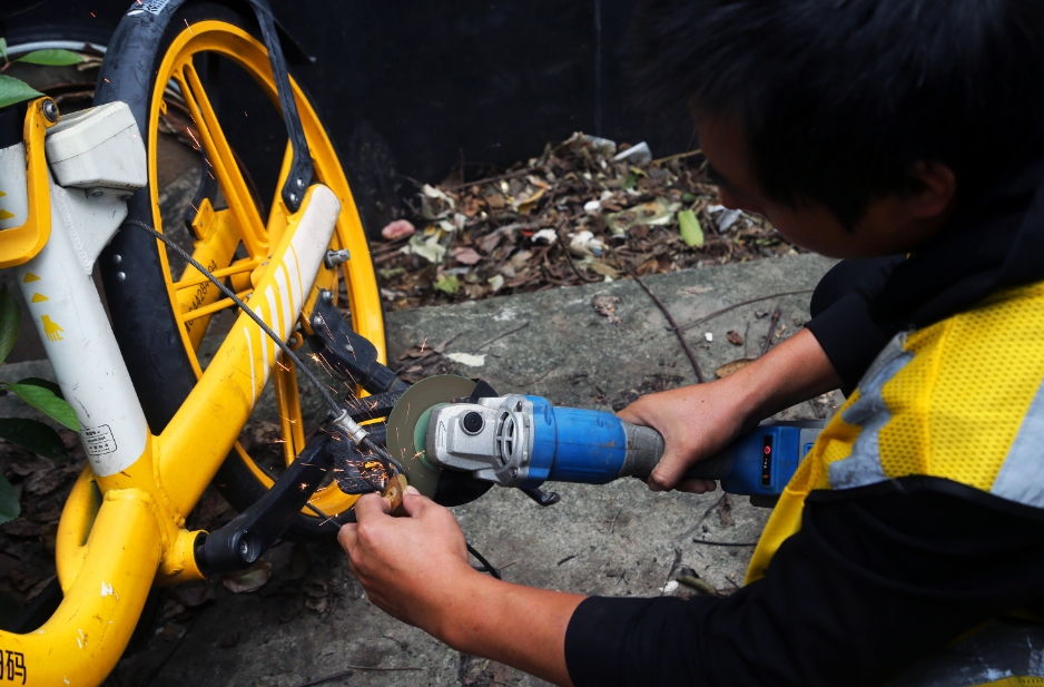宋春雨在切割锁在共享单车上的私锁