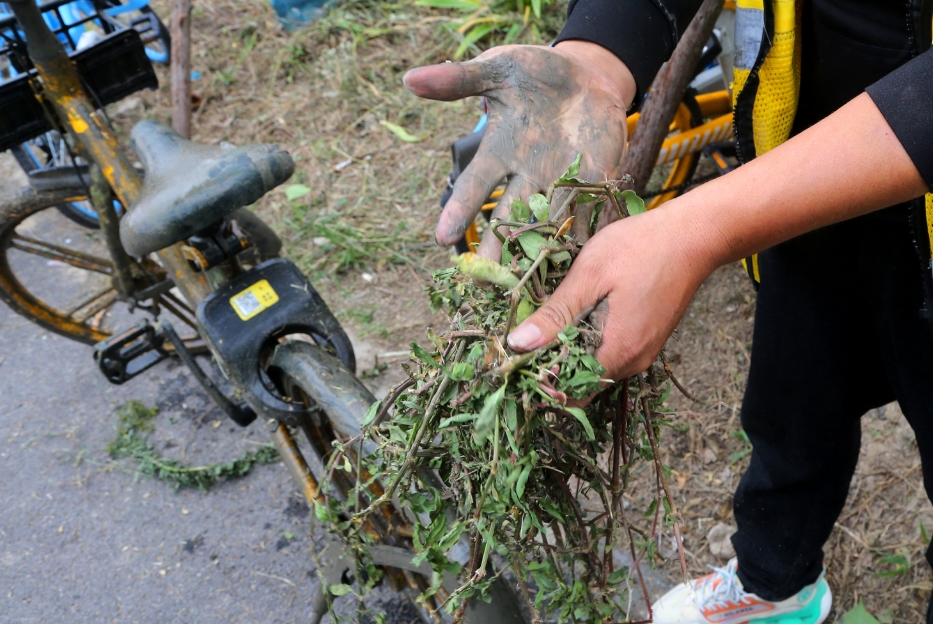 “在这呢!”一头扎进杂草堆里的宋哥大喊了一声,所有人随即朝他奔去。现场,一辆布满尘土的单车正孤零零横躺在遍布垃圾的地上。宋春雨说,有时候草上会长有倒刺,搬车的过程中很容易划伤手脚。“这算什么,有的人还会把单车丢进树林里,如果锁坏了,需要提起车后轮推着走,大冬天也能给你热出一身汗。”司华严附和道。