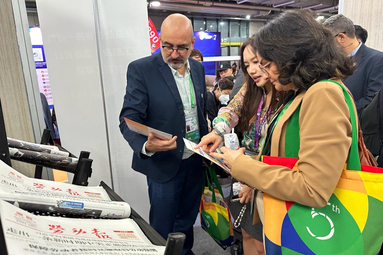 莫雷拉和代表团成员在阅读职工驿站简介,并了解《劳动报》当天报道内容