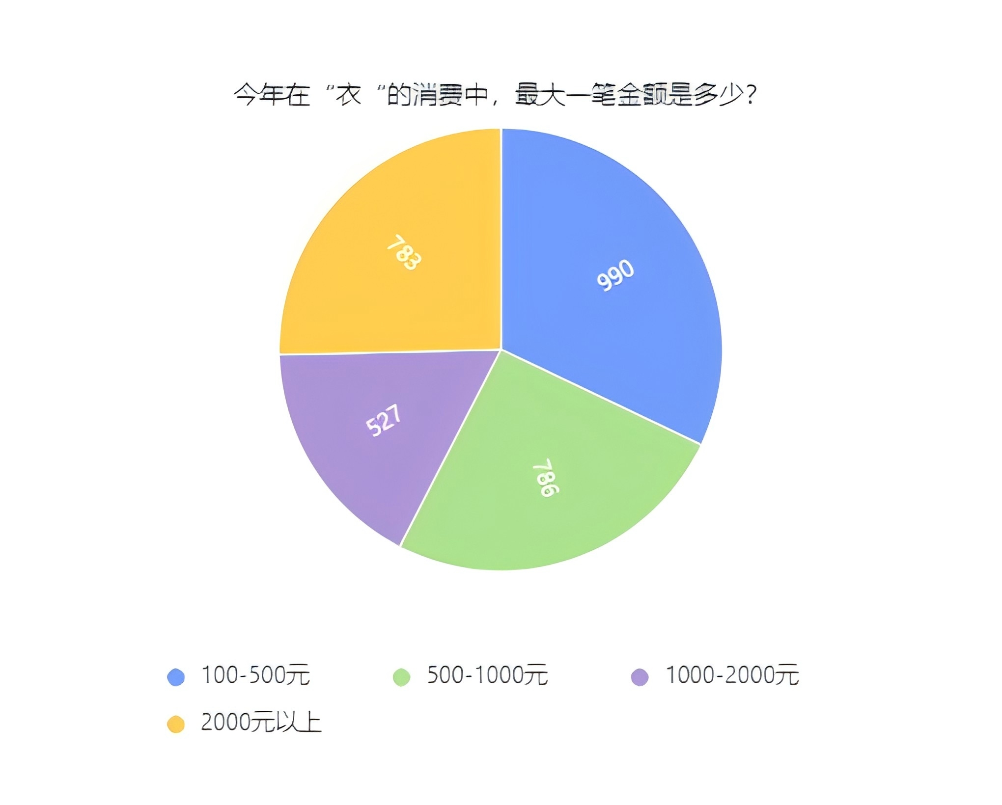 在调查中,关于今年在“衣”方面最大的一笔消费是多少?有32%的受访者选择了不超500元。在总体消费金额方面,约60%的受访者选择了和去年持平以及略低于去年。