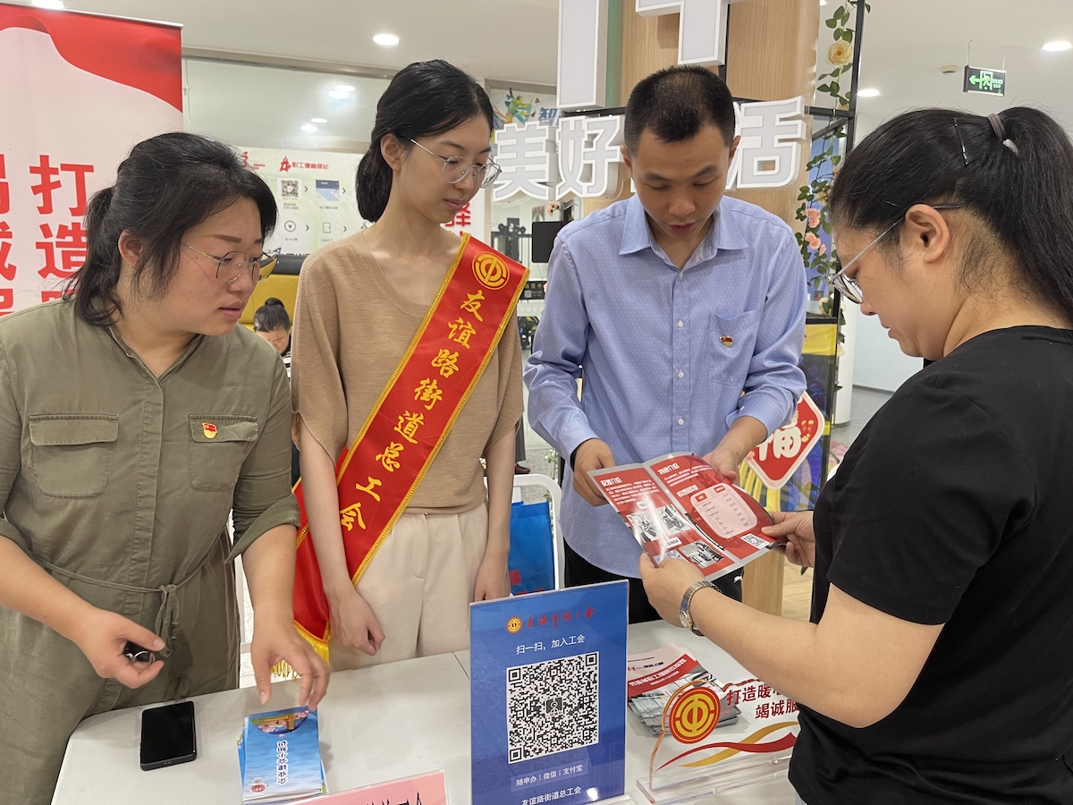 “袁琳方”在参与街道志愿服务,为区域职工介绍工会服务。
