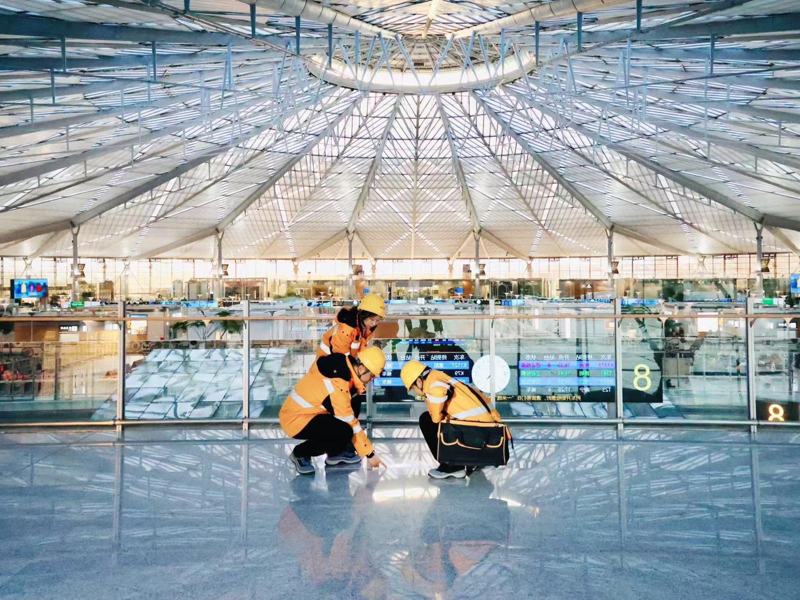 今天,随着2025年一季度全国铁路列车运行图实施,形似“飞碟”的铁路上海南站完成历经近6个月的提档升级改造,正式迈入高铁时代,迎来了高铁列车。这几天,来自中国铁路上海局集团有限公司上海房建公寓段上南房建班组的三位00后小姑娘格外忙碌,她们头戴安全帽,穿着橘色防护服,身背白色工具包,手持望远镜,为车站“找茬”——检查和维修上海南站房建设备,将各种影响旅客出行以及列车运行的安全隐患扼杀在摇篮里。