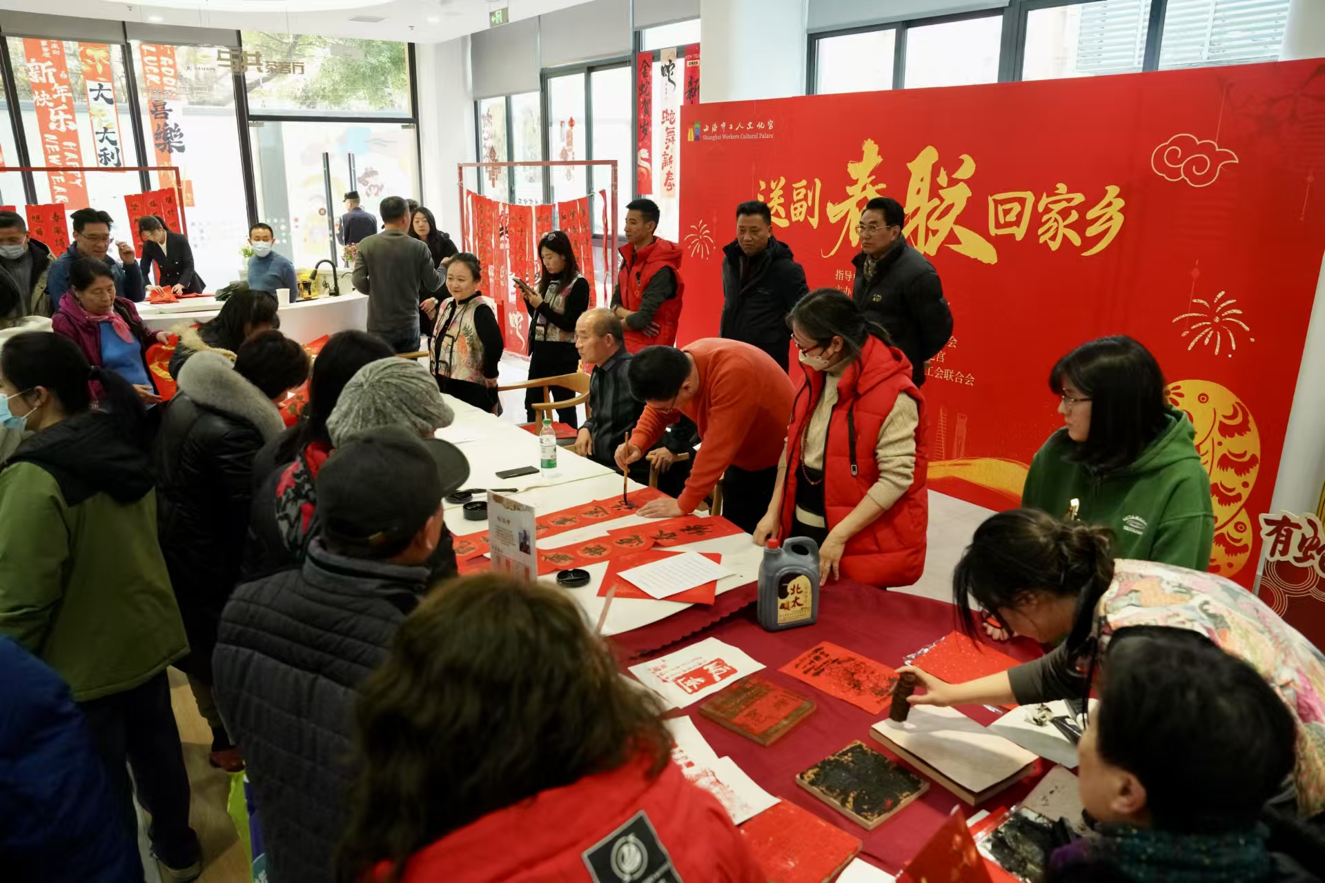 今天的活动现场热闹非凡,处处洋溢着迎新送福的喜庆氛围。上海市工人文化宫的书法家们挥毫泼墨、笔走龙蛇,书写寓意吉祥的春联、福字,为职工们送上新春祝福。静安区文明办带来了“迎新春 送福贴”活动,与职工群众热情互动,共同传递着新年的祝福与文明的力量。由静安区工人文化宫精心筹备的非遗传承体验活动,则让职工近距离接触和了解中华优秀传统文化,感受其独特的魅力和价值。
