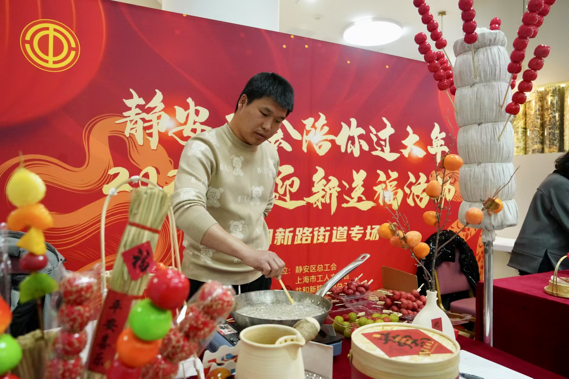 迎新春送春联,制作糖葫芦、中国结、非遗拓印……今天,静安区共和新路街道党群服务中心里洋溢着浓浓年味,随着“静安工会陪你过大年”2025年迎新送福活动拉开帷幕,一系列丰富多彩的活动火热进行,在新春即将到来之际为职工送上工会的关爱和陪伴。