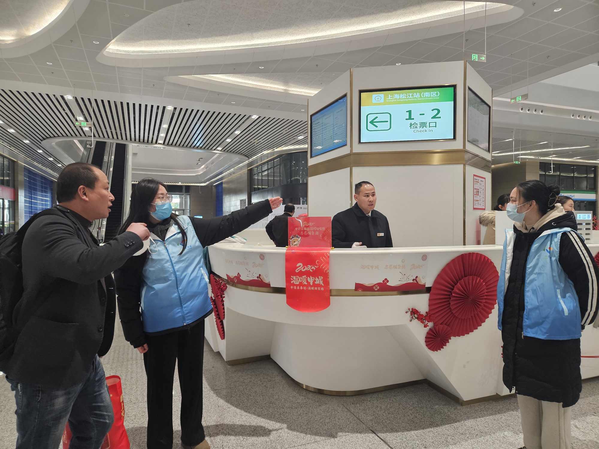 新建成的上海松江站于2024年12月26日开通运营,迎来开通运营后的第一个春运。截至目前,日均客流量近3万人次。为确保春运期间松江站的正常运行,应对客流高峰,该站组建起了一批松江枢纽春运保障工作志愿者,为回乡旅客协助购票、指引方向、搬运行李……他们的暖心服务成了松江枢纽春运期间一道亮丽的风景线。