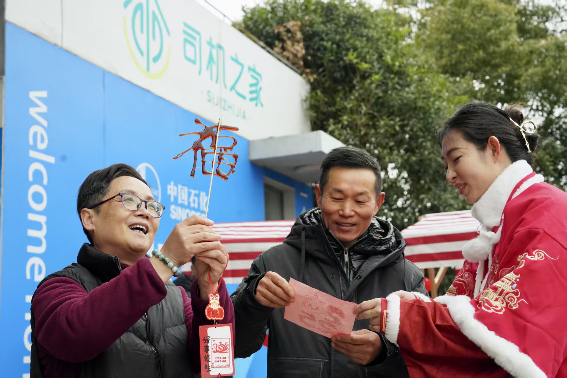 拓印区域人气高涨,展位前人头攒动,由奚小琴设计的“蛇盘兔”拓印图案,寓意着新的一年里财源广进的美好心愿。加油站志愿者提前将剪纸图案制成印章,书写好心愿卡,制成精致挂饰,帮车友系挂在驾驶室。卡车司机钱师傅吃着汤圆说道,“这个活动特别好,特地做了这个心愿卡,希望新的一年越来越好。”在糖画制作区域,车友们不仅可以近距离观看糖画制作过程,还能获赠精美的糖画,为活动增添了欢乐气氛。