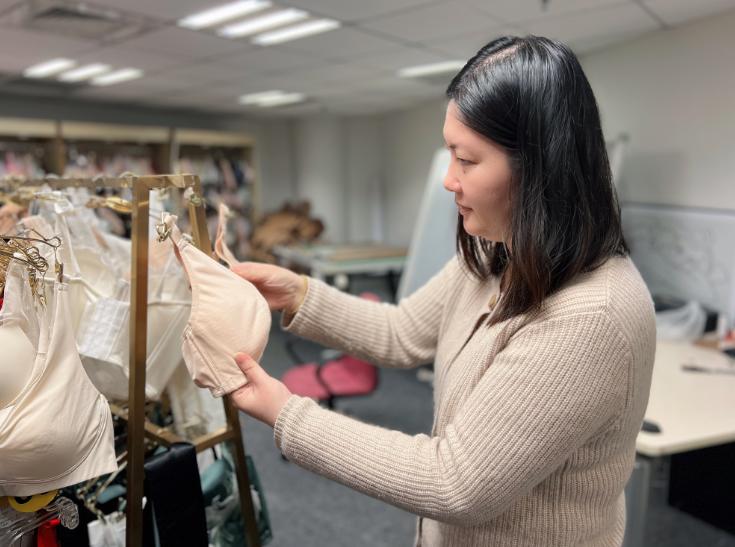“以往被切除乳房的女性,不少术中会做淋巴清扫,腋下会凹凸不平甚至缺一块肉。普通文胸的腋下塑片接口是直接朝外的,若按此工艺制作义乳文胸,结合处会频繁摩擦伤口,让穿着者感到不适。因此我们特意将收口隐藏设计,并在其表面覆盖了一层丝光棉,这样既能固定硅胶,又能确保光滑轻盈,不刺激脆弱的皮肤。”张樱说,新款义乳文胸对于纺织原料也进行了改进,由棉、氨纶、锦纶等材料混纺而成,相较于之前的产品,不仅透气性增加,支撑力也大大提高,女性穿戴后会感到更加舒适。“义乳文胸业态在公司占比不到1%,同样外观下,它的工艺比普通文胸更加复杂,成本也会多出15%—20%,但我们依旧坚持投入研发和生产,并且在旗舰店辟出专门空间服务有这类需求的女性,毕竟每个人都有追求美的权利。”